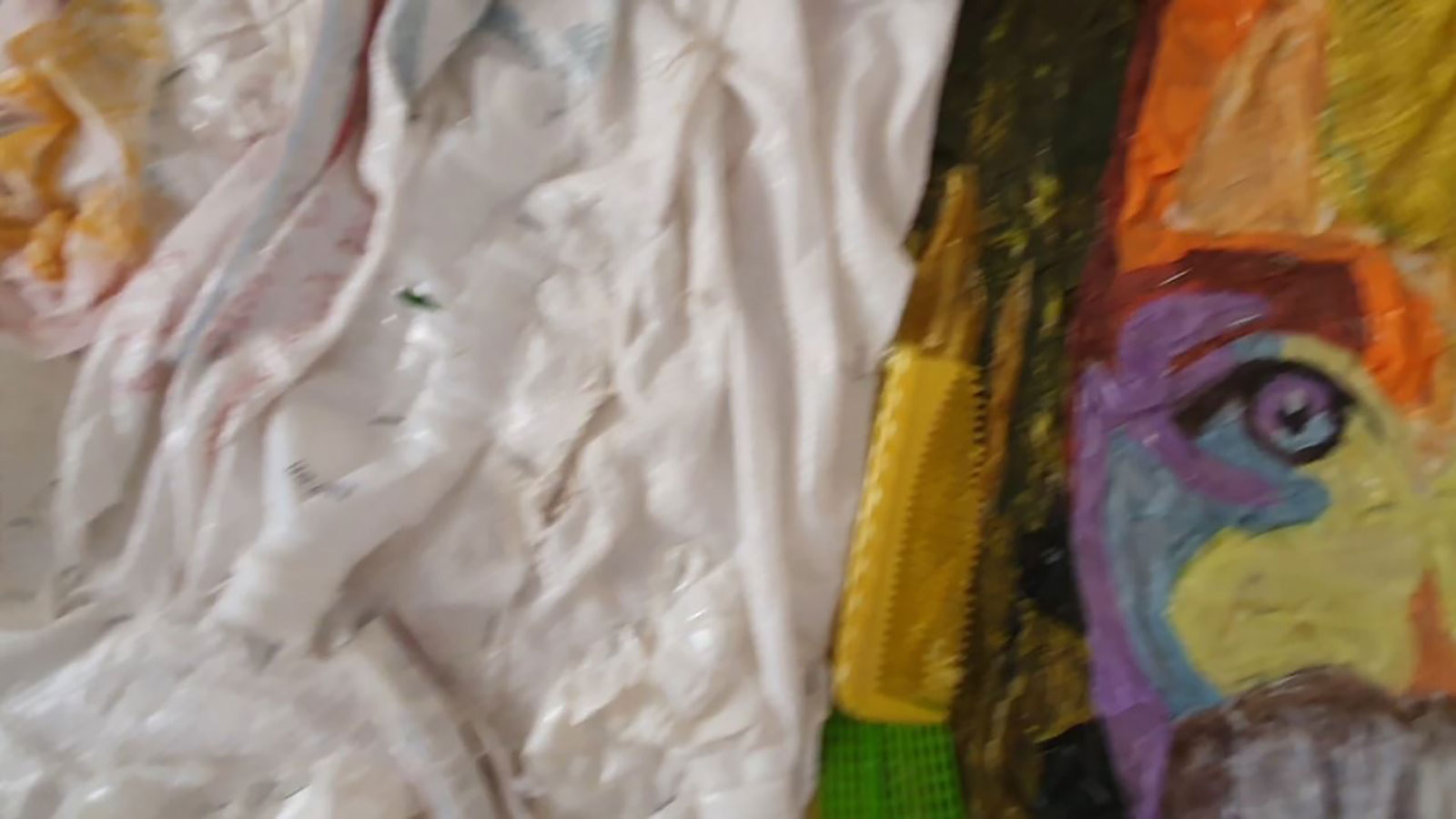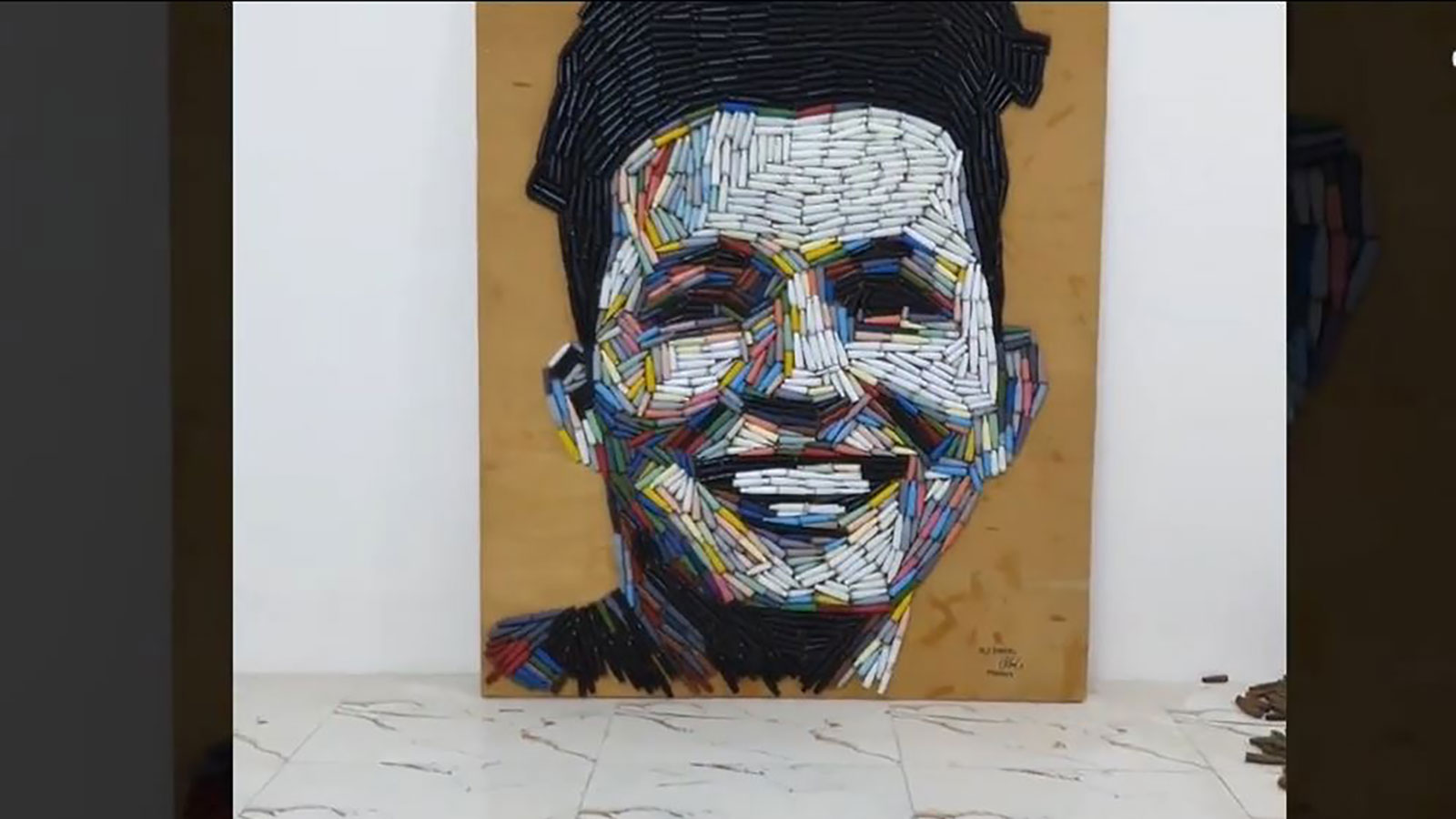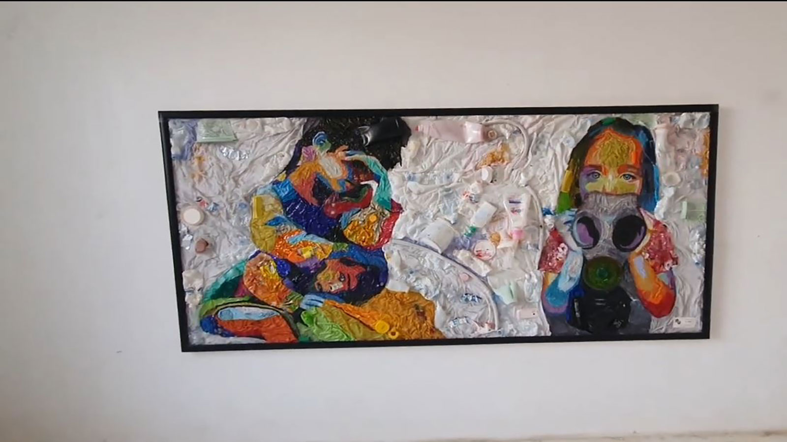 بلمسة فنية، ثبت علي العبوات والأكياس على اللوحة، باعثا من خلالها عدة رسائل، الأولى تتعلق بالفقر الذي يدفع الأطفال والنساء للبحث في النفايات، أما الثانية فهي الحفاظ على البيئة من "خطر البلاستيك"، الموضوع الذي تحذر منه منظمات عالمية ودولية عديدة.