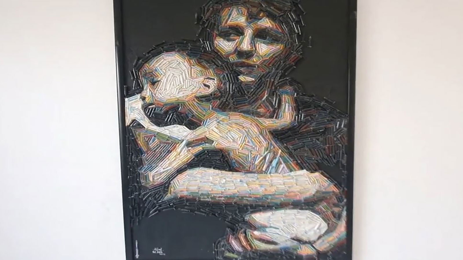 من اللوحات المميزة لدى الفنان الشاب، والتي شارك بها في مهرجانات محلية، نجد لوحة "الأم" التي تحتوي على ألفي حقنة طبية، مثيرا خيال المتلقي، وفاسحا له الطريق لتفسير معانيها.
