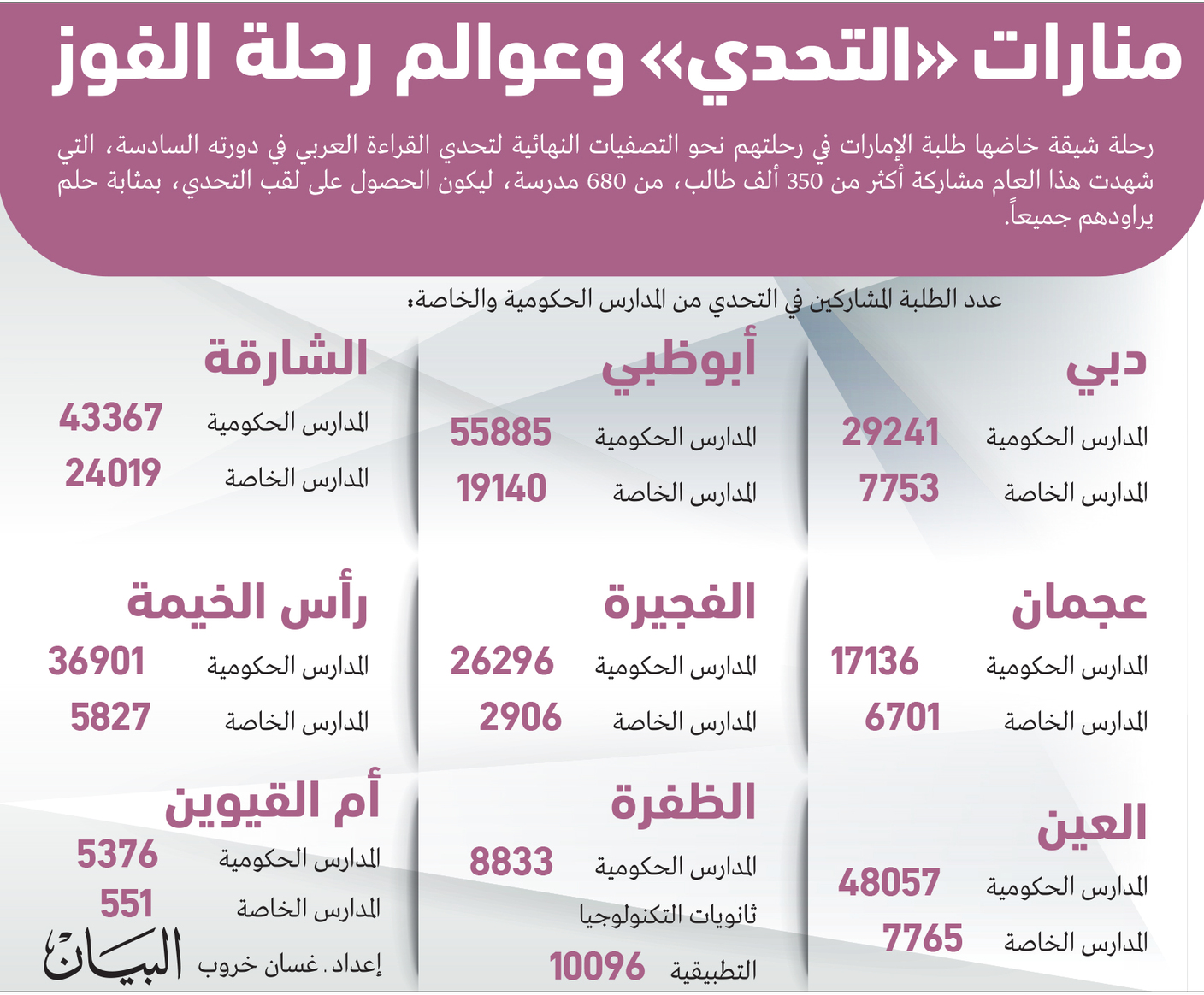 وقالت: «هذا التحدي الذي يصنع الشغف بالمعرفة على اختلاف أنواعها ومصادرها، والذي يترجم رؤية صاحب السمو الشيخ محمد بن راشد آل مكتوم، في كيفية إعداد الأجيال المقبلة، لتكون على قدر المسؤولية في مواصلة الطريق لتحقيق إنجازات دولة الإمارات على كافة الصعد، حيث يحظى التحدي بدعم سموه واهتمامه الكبير، ليكون محطة رئيسية في مسيرة طلبتنا المعرفية، وموجهاً لشغفهم في كافة مراحل تطورهم وتقدمهم».