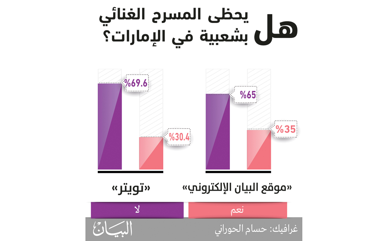 في توليفة تجمع بين عناصر التمثيل والغناء والاستعراض، نتج ما يسمى بالمسرح الغنائي، الذي لا يقتصر على التمثيل والحوار، إنما تؤدى فيه الاستعراضات الغنائية، حيث تشير المصادر إلى أن هذا الفن انطلق في عام 1866 في مدينة نيويورك، وتطور المسرح الغنائي، ليحظى بشعبية حول العالم، وبرز في العالم العربي «الرحابنة»، حيث قدم الأخوان عاصي ومنصور الرحباني، أعمالاً مسرحية غنائية، نالت كثيراً من الاهتمام.. ومع الحركة المسرحية النشطة في الإمارات، وتعدد المسارح على مستوى الدولة، يتبادر السؤال.. هل يحظى المسرح الغنائي بشعبية في الإمارات؟ طرحنا هذا السؤال على الموقع الإلكتروني لصحيفة «البيان»، فجاءت النتيجة أن 35 % يرون أن للمسرح الغنائي شعبية في الإمارات، بينما خالفهم 65 %، ولم تختلف النتيجة على حساب الصحيفة على موقع التواصل الاجتماعي «تويتر»، حيث يرى 30.4 % أن للمسرح الغنائي شعبية، بينما رأى 69.6 %، أنه لا شعبية لهذا الفن المسرحي.