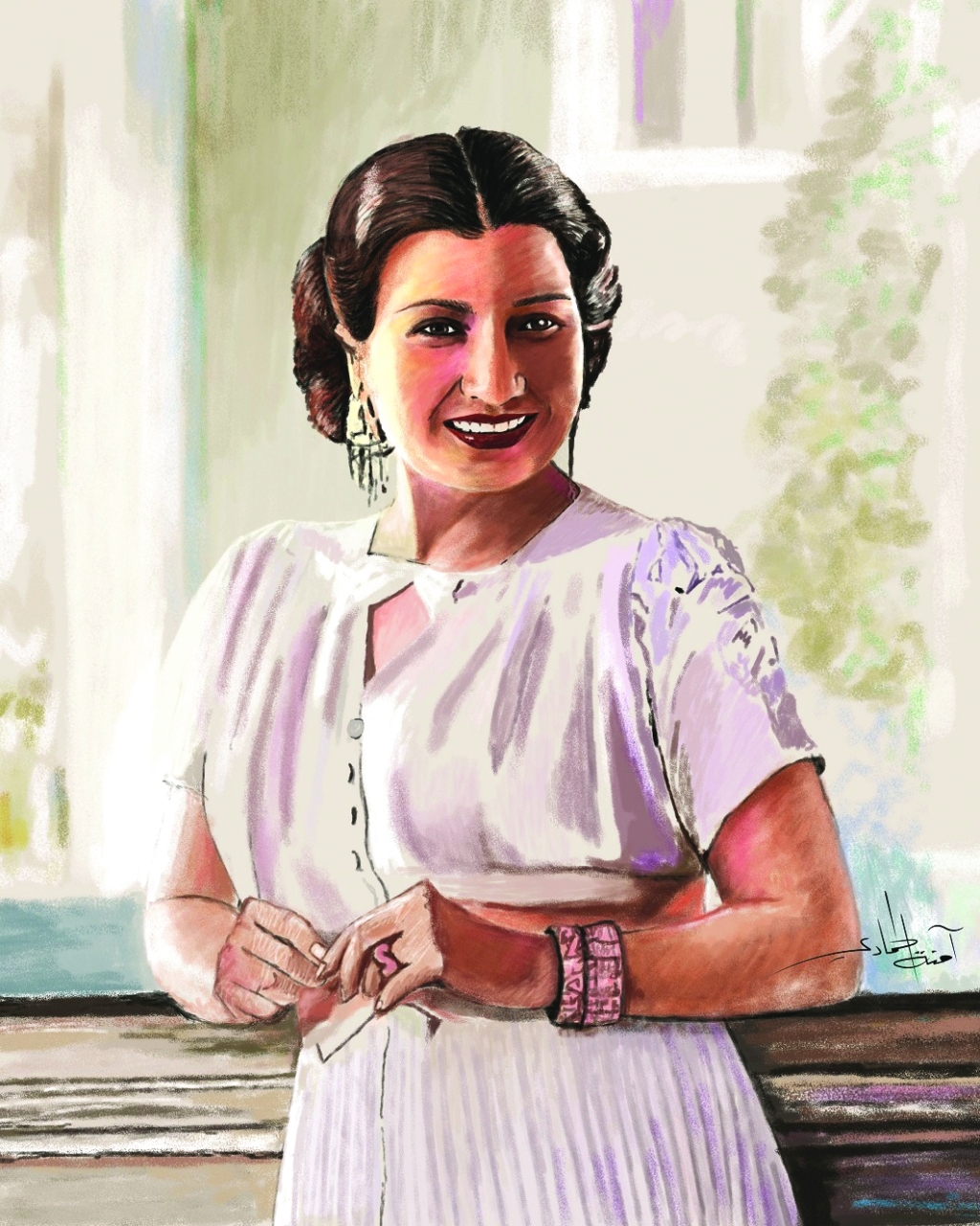 وبينت: «تتناول اللوحة الأولى أم كلثوم الإنسانة وما تحتويه عظمة شخصيتها من رقة ورومانسية وعمق تجلى في اختياراتها الدقيقة من كلمة ولحن وأداء، فعكست اللوحة جمال وتفاصيل أم كلثوم الشباب والتألق، وعبرت عنه من خلال تناغم وإشراقة الألوان.