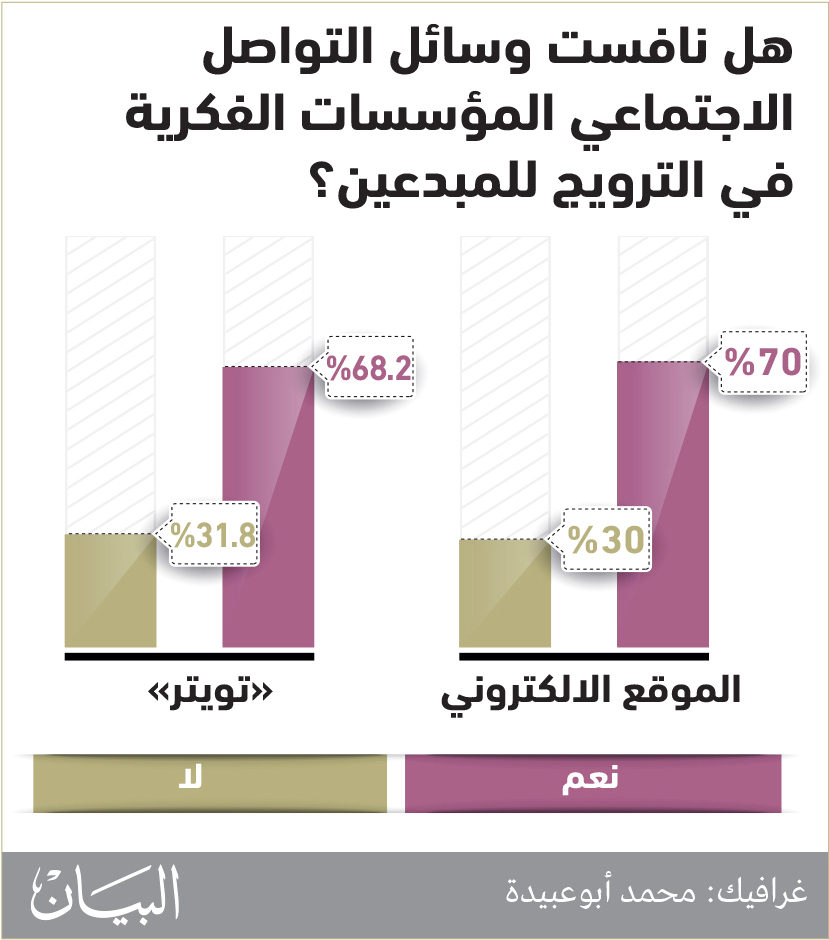 «البيان» حاولت أن تستكشف عبر الاستطلاع الأسبوعي مدى نجاح وسائل التواصل في منافستها للمؤسسات الفكرية في تقديم الدعم والترويج للمبدعين، حيث طرحت السؤال التالي: هل نافست وسائل التواصل الاجتماعي المؤسسات الفكرية في الترويج للمبدعين؟ وأكدت نتائج الاستطلاع نجاح مواقع التواصل الاجتماعي في هذا الشأن، إذ صوتت نسبة 70 % بنعم على موقع «البيان» الإلكتروني، بينما صوتت نسبة 30 % بلا، وجاءت نتائج الاستطلاع على موقع «البيان» في «تويتر» متقاربة، إذ صوتت نسبة 68.2 % بنعم، بينما صوتت نسبة 31.8 % بلا.