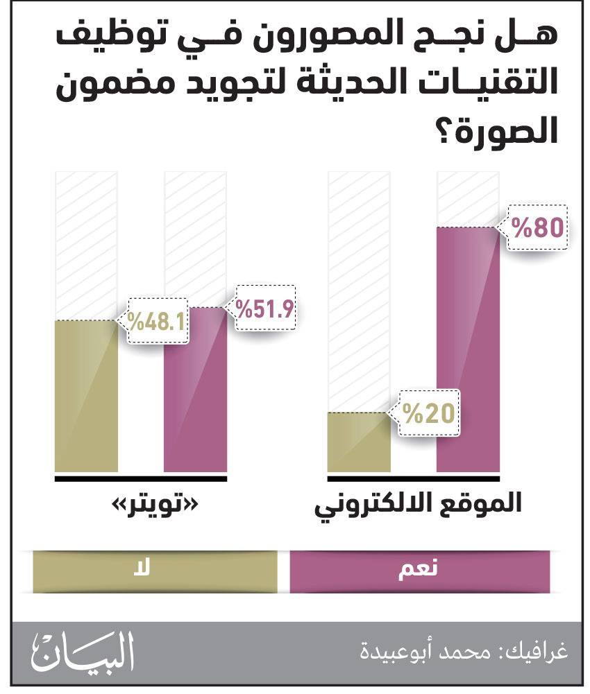 «البيان» حاولت أن ترصد مدى نجاح المصورين في استخدام التقنيات الحديثة، عبر الاستطلاع الأسبوعي، حيث طرحت على متابعيها في مواقع التواصل الاجتماعي، السؤال التالي: هل نجح المصورون في توظيف التقنيات الحديثة لتجويد مضمون الصورة؟