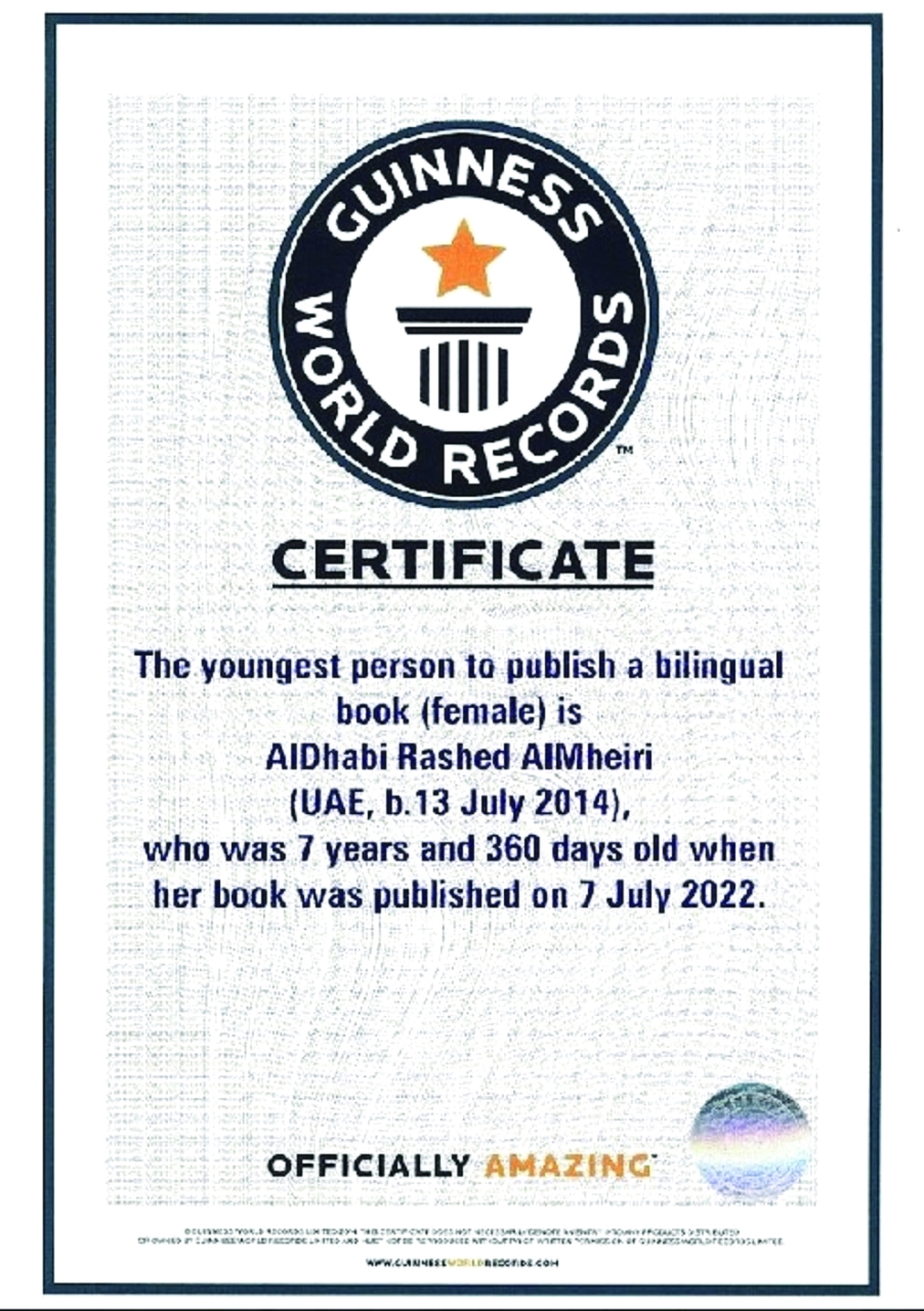 هذا وقالت المهيري لـ«البيان»: «أشعر بالفخر والفرح كون اسمي سجل بموسوعة غينيس، وأشجع كل الأطفال أن يكتبوا لأجل أن يعبروا عن مشاعرهم وينشروا كي يقرأ لهم الناس ليس في الإمارات بل في العالم كله».