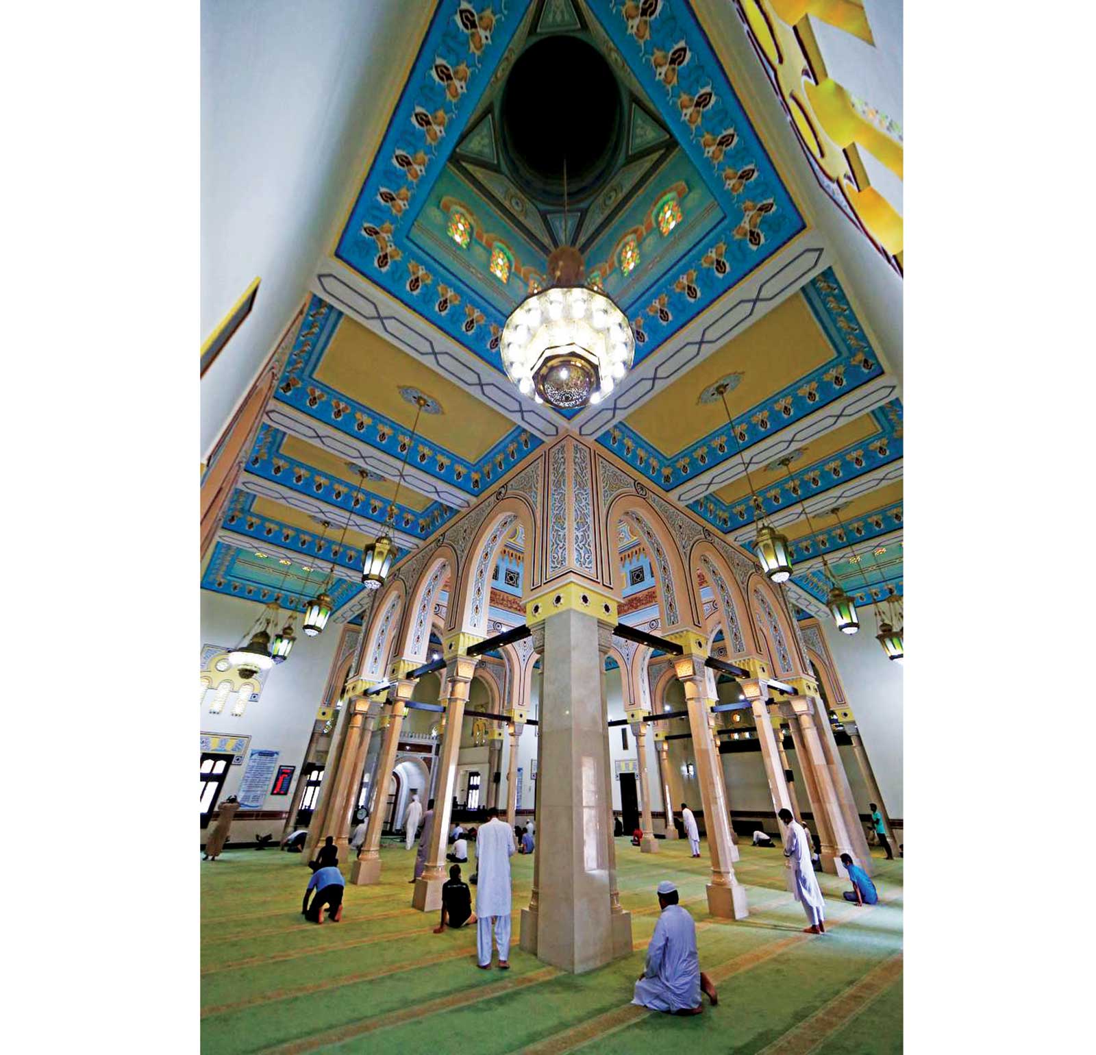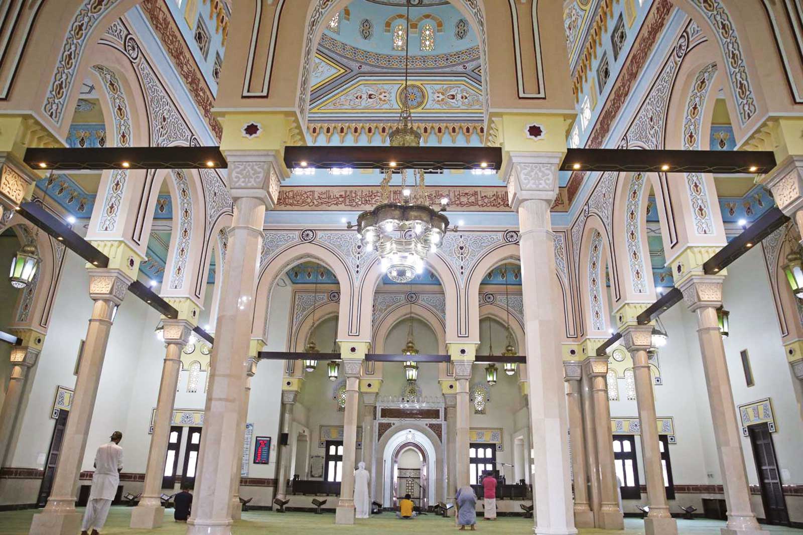 روعة العمارة الإسلامية في «جميرا الكبير» ليست قاصرة فقط على شكله الخارجي، وإنما تتجلى جمالياتها أيضاً في داخله، حيث يكمن سحر المشهد الذي يشع إيماناً، بفضل الزخرفة البديعة والألوان البهية التي أكسبت المسجد خصوصية كاملة، ومنحته شكلاً فريداً، تميز بالخطوط العربية الأصيلة التي خطت بها آيات الذكر الحكيم التي تكاد تلف مركز المسجد وجوانبه كلها، وهو ما ستلحظه بمجرد أن تلج من بوابات المسجد، لتبهرك غابة الأعمدة النحيلة التي ترفع سقف المسجد، وقد وزعت بطريقة لافتة، بينما تبدو الأقواس الداخلية أشبه بحلل بديعة، وقد كسيت جميعها بزخرفة جصية نادرة، صبغت بألوان بهية قادرة على خطف العيون، لتبرز بذلك الجهد المعماري المبذول، والذي يتجلى تماماً على الجدران والسقف، وكذلك المحراب الذي يتميز بتقشفه من الزخرفة المبهرة، ليحافظ في ذلك على ما يمتلكه المسجد من بهاء خاص.