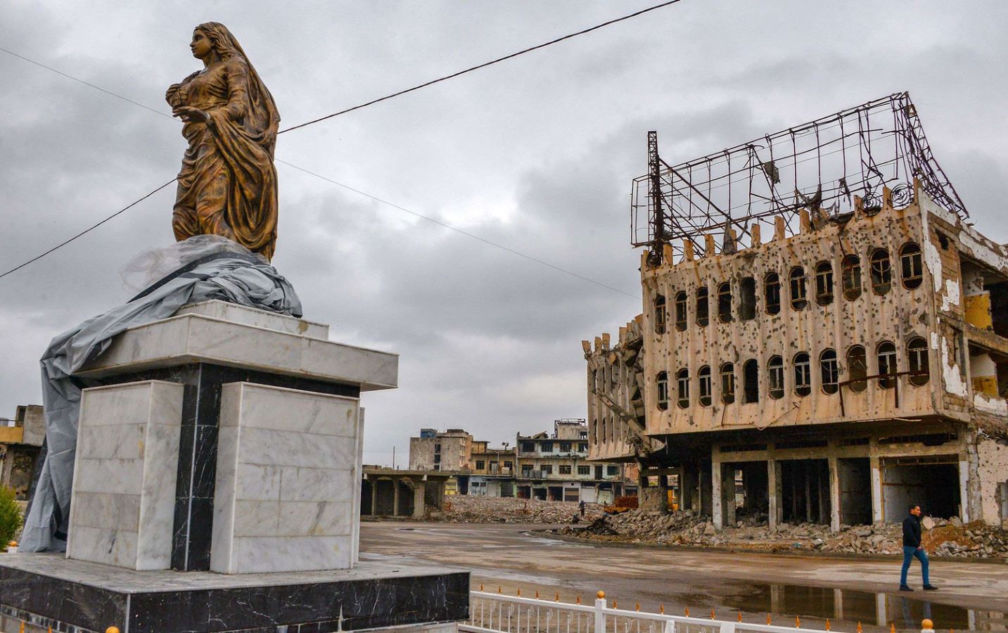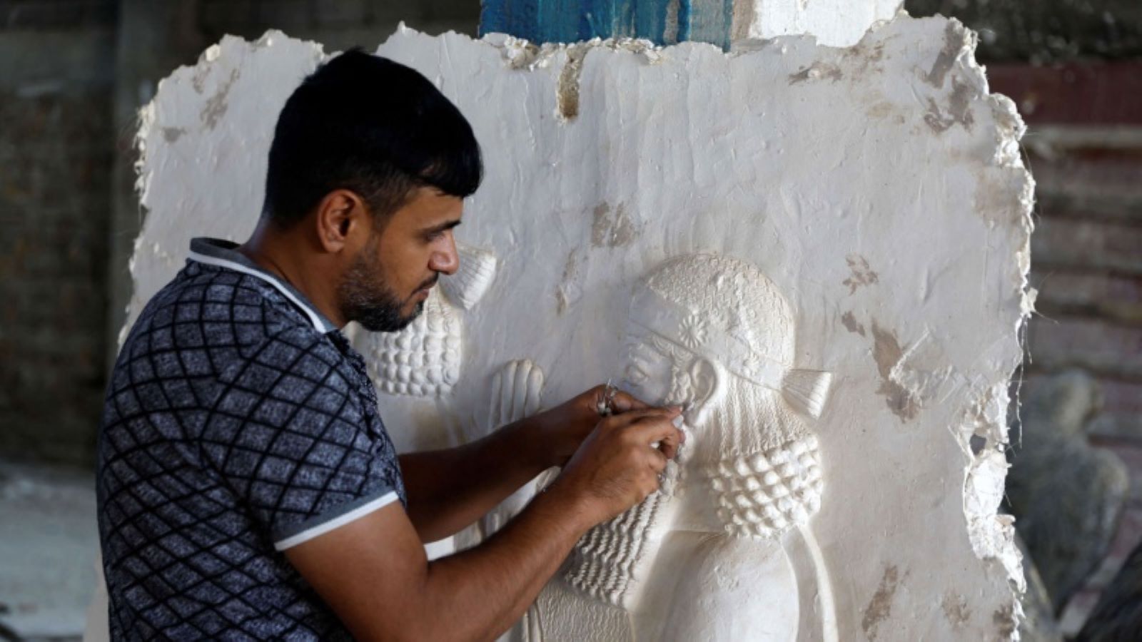 وتعكس لوحاته الجدارية المصنوعة من الطين تاريخ البلاد الطويل من الفترة الآشورية إلى فترة "داعش".