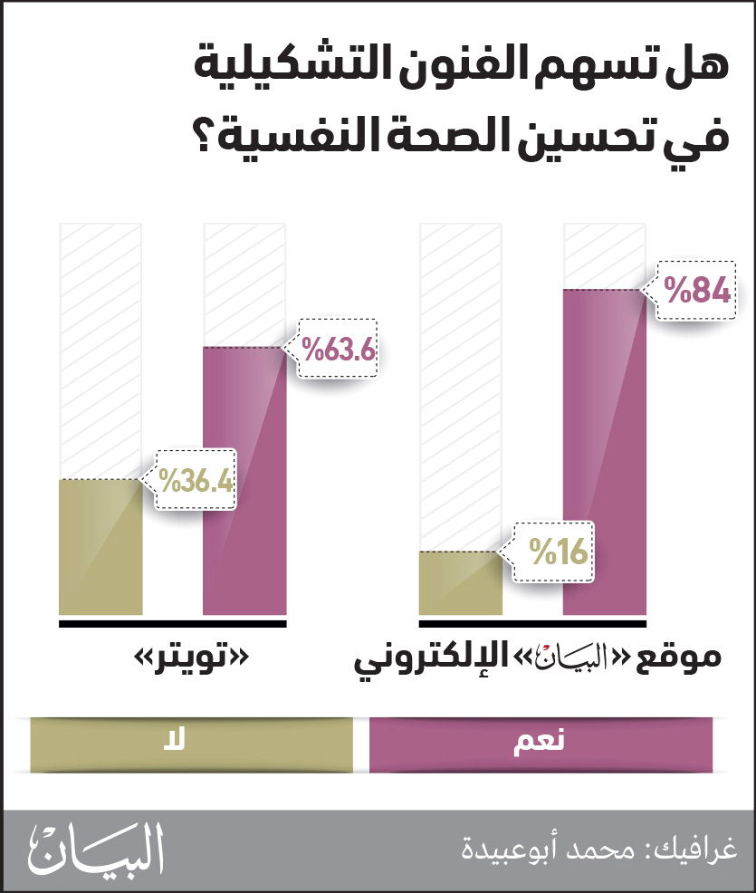 وقد أظهرت نتائج الاستطلاع، أهمية الفنون التشكيلية في تحسين الصحة النفسية، إذ أوضح 84 % من المشاركين بالاستطلاع على موقع «البيان» الإلكتروني، أن الفنون التشكيلية تحسن الصحة النفسية، بينما رأى 16 % غير ذلك، وجاءت نتائج التصويت على منصة الـ«البيان» على «تويتر» متشابهة، حيث أكدت نسبة 63.6 % دور الفنون في نشر ثقافة الصحة النفسية والعلاج، بينما رأى 36.4 % عكس ذلك تماماً.
