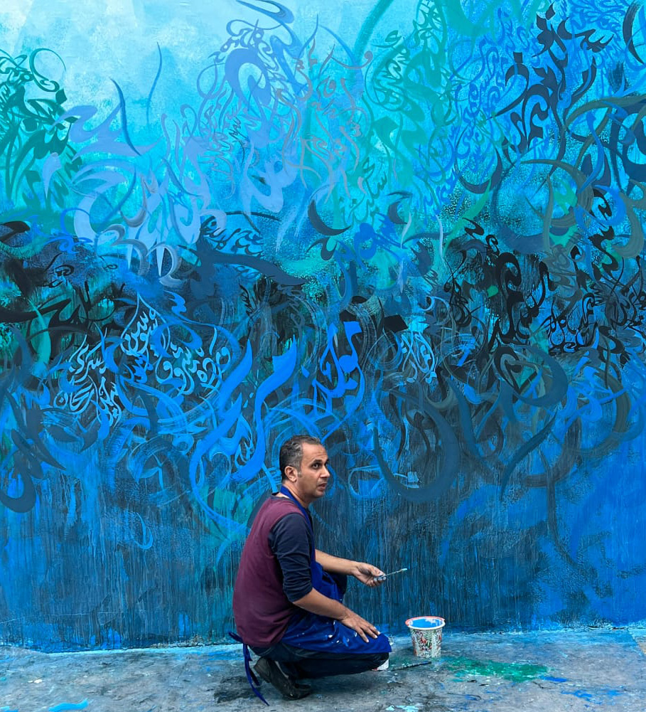 تحولت الحروف في تلك اللوحة إلى سيمفونية الماء والأزرق، وكأن اللغة تتمرأى في الماء، وكأن الفنان الحروفي يقصد في إحدى تجليات عمله، أن الحرف وفن الخط مثل البحر، لا يتوقف عن توليد الاشكال والصيغ الجديد والآنية للحرف، وأن الحرف لغة بصرية لا حدود لها.