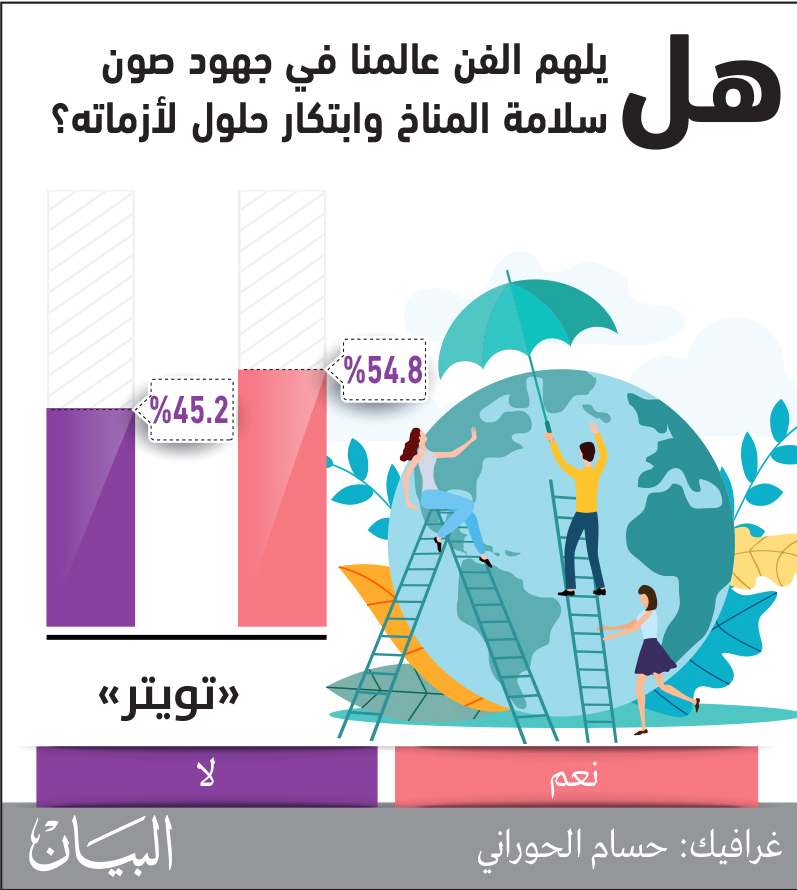 «البيان» حاولت عبر الاستطلاع الأسبوعي، أن تستكشف مدى نجاح الفنون في رفع مستوى الوعي البشري حول قضايا البيئة، حيث طرحت على متابعيها في مواقع التواصل الاجتماعي السؤال التالي: هل يلهم الفن عالمنا في جهود صون سلامة المناخ وابتكار حلول لأزماته؟