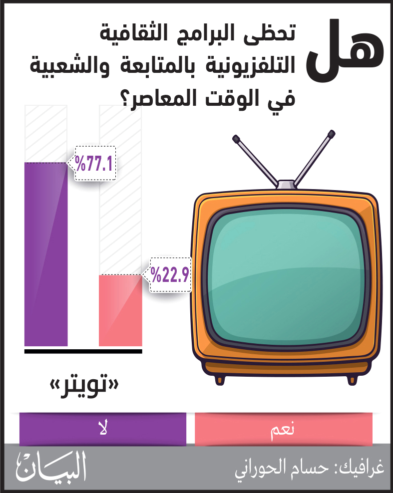 وأكدت نتائج الاستطلاع أن البرامج الثقافية لم تعد تحظى باهتمام وشعبية كبيرة، حيث صوتت على موقع «البيان» في «تويتر» نسبة 77.1 % بلا، بينما صوتت فقط نسبة 22.9 % بنعم.