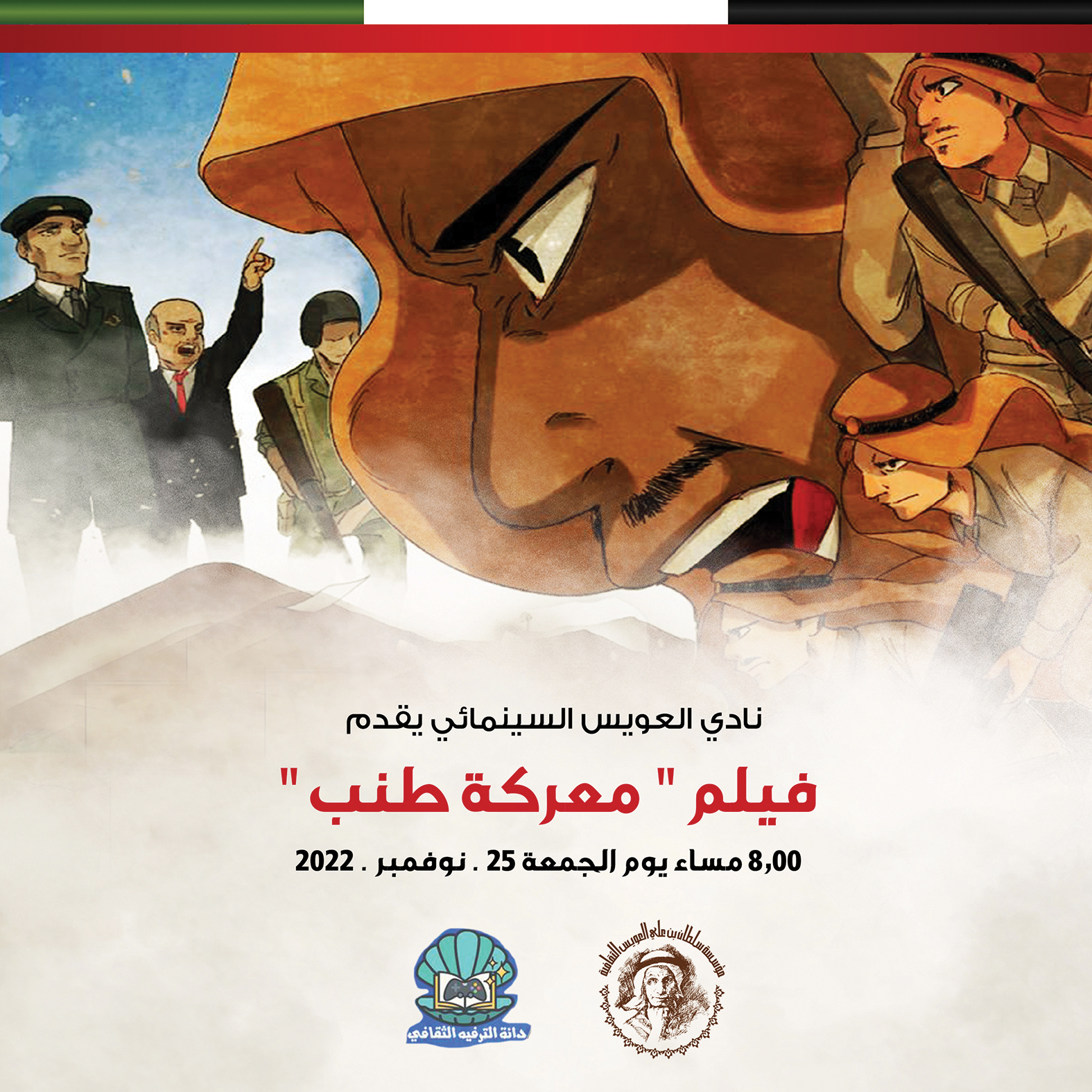 تنظم مؤسسة سلطان بن علي العويس الثقافية في الساعة الثامنة من مساء يوم الجمعة المقبل ضمن أنشطة نادي السينما عرضاً للفيلم الكرتوني «معركة طنب» الذي يحكي قصة «أول شهيد إماراتي»، الشرطي سالم سهيل، وكان هذا الفيلم قد حصد آلاف المشاهدات خلال إطلاقه في نوفمبر الماضي كما سجل الفيلم تفاعلاً كبيراً وردود فعل إيجابية واسعة.