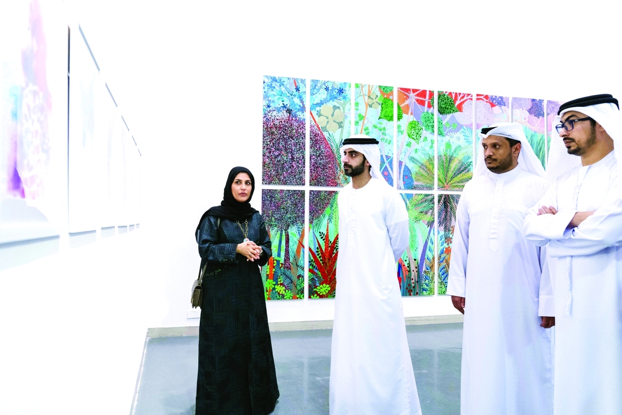 واستمع رئيس مكتب سمو الحاكم إلى شرح من الفنانين المشاركين حول أعمالهم ودلالاتها والفنون المستخدمة فيها للخروج بأعمال تجسد الفن بين الماضي والحاضر والمستقبل.
