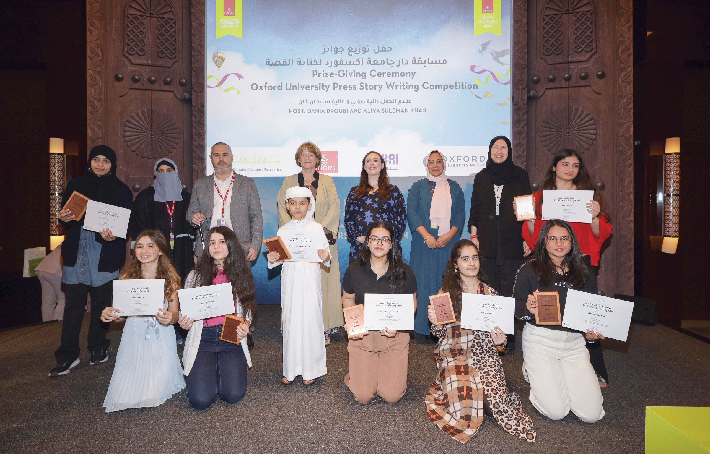 كرّم مهرجان طيران الإمارات للآداب، في حفل خاص، الفائزين في مسابقة دار جامعة أكسفورد للطباعة والنشر لكتابة القصة. وقد غدت هذه المسابقة السنوية، مناسبة هامة ضمن التقويم الأكاديمي، إذ بلغ عدد المشاركات، لهذا العام، أكثر من 3700 مشاركة من طلبة الإمارات العربية المتحدة. وقد تفضل كل من المؤلفين ميثاء الخياط ومهند العاقوص وكاثلين بوتي، بتسليم الجوائز للفائزين.