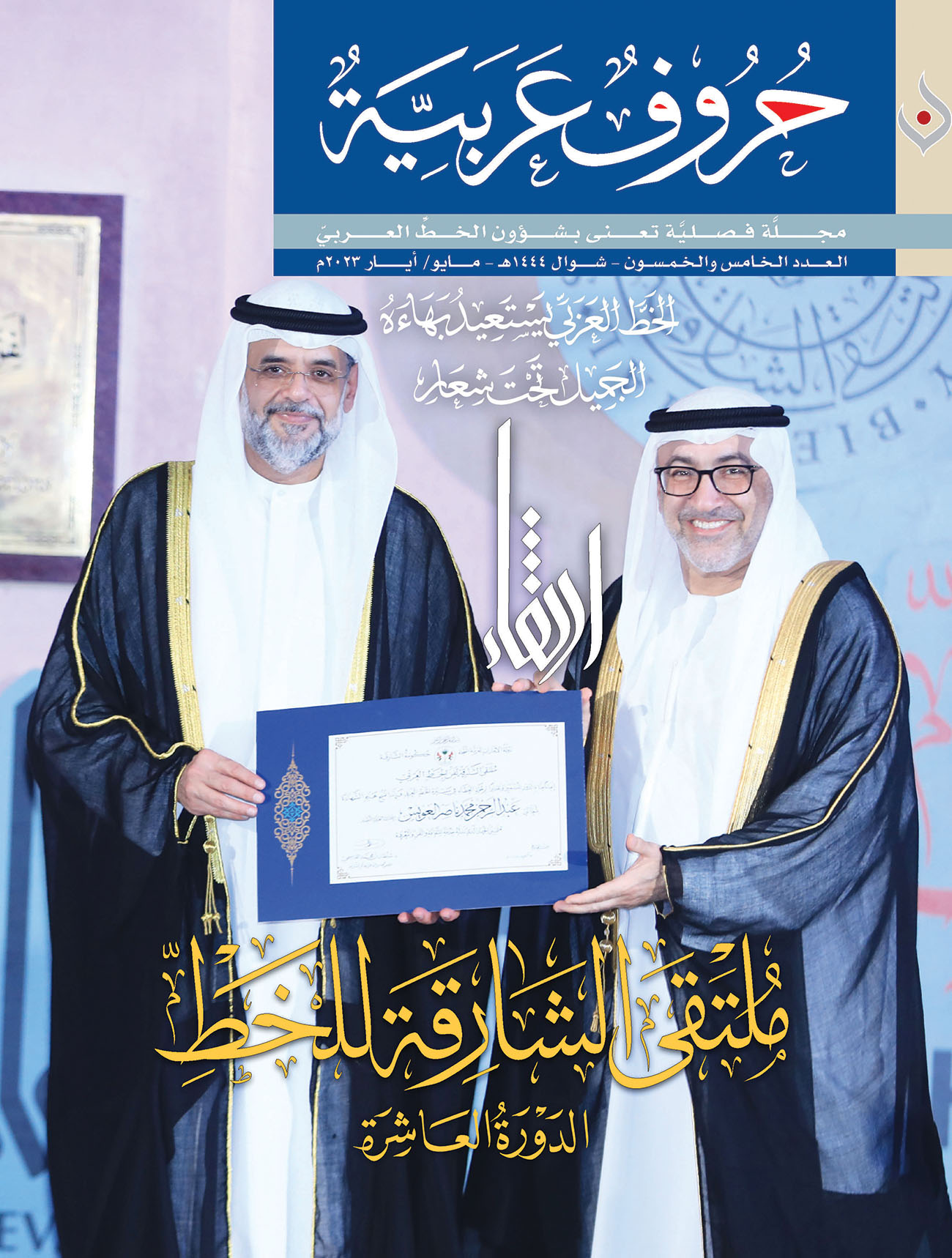 ضمن إصدارات ندوة الثقافة والعلوم بدبي في معرض أبوظبي للكتاب، صدر العدد الجديد رقم (55) من فصلية «حروف عربية»، التي يرأس تحريرها الإعلامي الإماراتي علي عبيد الهاملي، نائب رئيس مجلس إدارة الندوة، كما يشغل منصب نائب رئيس تحريرها الخطاط والفنان خالد الجلاف، وأما مدير التحرير فهو ناصر عراق والمدير الفني محمد فراس عبو.