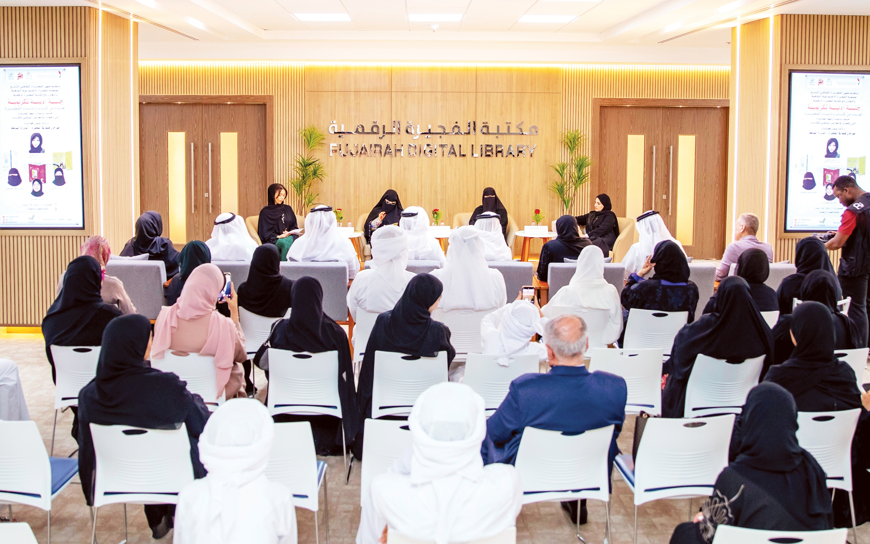 نظم مقهى الفجيرة الثقافي أمسية أدبية تكريمية، بالتعاون مع مكتبة الفجيرة الرقمية التابعة لجامعة الفجيرة، وذلك بحضور الشيخ عبدالله بن حمد بن سيف الشرقي، وصابرين اليماحي، عضو المجلس الوطني الاتحادي، وخالد الظنحاني، رئيس مجلس إدارة الجمعية، ومحمد الملا، نائب رئيس جمعية الفجيرة الخيرية، وزينب المطوع، مديرة العلاقات العامة بالمكتبة، وعدد من المثقفين والإعلاميين.