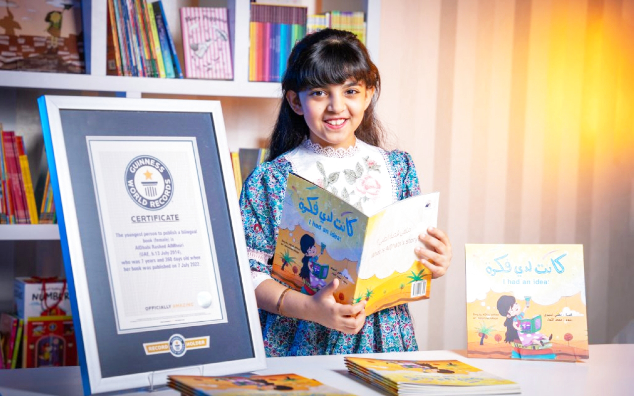 وتحت عنوان «لقاء مع الظبي المهيري: ابنة التسع سنوات»، لفتت المؤسسة إلى أن المهيري تحمل لقب أصغر رائدة أعمال وناشرة إماراتية، ليس هذا فحسب، وإنما تحمل أيضاً الرقم القياسي في موسوعة غينيس للأرقام القياسية أصغر ناشرة في العالم لكتاب ثنائي اللغة.