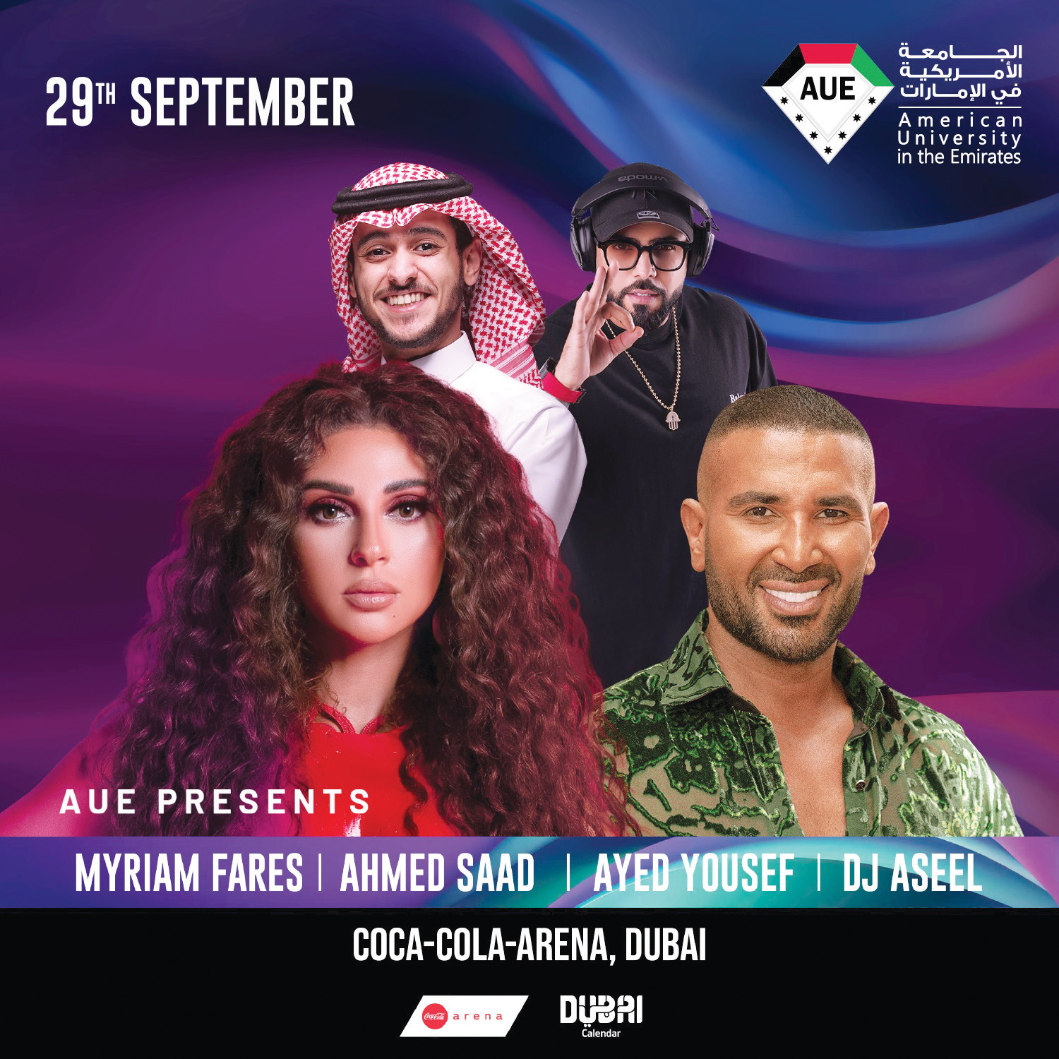 تحت شعارها في جميع نشاطاتها «لا شيء مستحيل»، تجمع الجامعة الأمريكية في الإمارات أربعة نجوم من فناني الوطن العربي، حيث يجتمع الفنانين اللبنانية ميريام فارس والمصري أحمد سعد والسعودي عايض والعراقي «دي جي أصيل» في حفل تخرج طلاب الجامعة من مختلف التخصصات، وذلك في يوم 29 سبتمبر الجاري، في «كوكا كولا أرينا» في مدينة دبي، ليشكل مزيجاً بين شرف وأهمية التخرج جنباً إلى جنب، مع احتفال آسر بتحقيق الإنجاز والتخرج، وهو ما خططت له الجامعة من أجل إحداث ليلة مميزة للطلاب وأهاليهم المدعوين، والجمهور الذي سيقوم بشراء تذاكر الحضور من الموقع المعتمد للحفل.