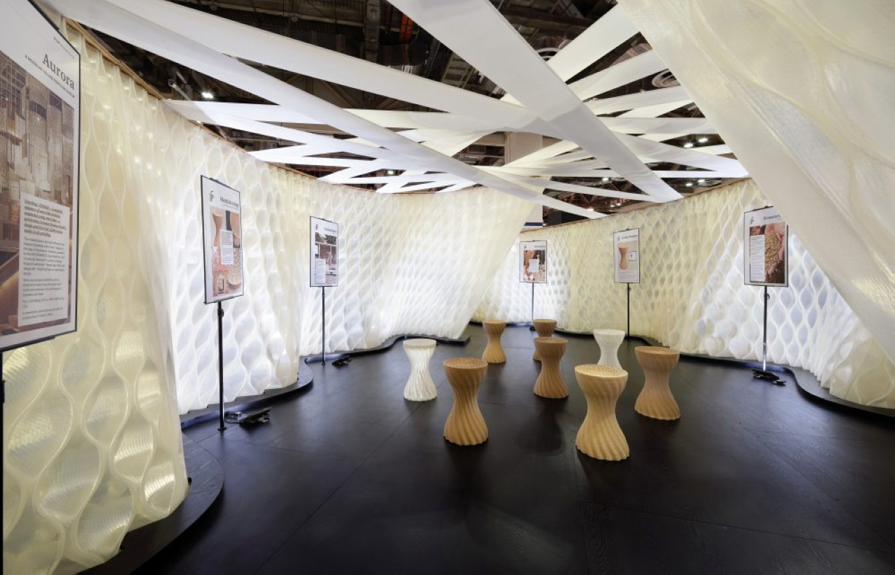 وجاء الجناح على شكل هيكل متموج منحنٍ يمثل رؤية التصميم الدائري، حيث يكتشف الزوار في الداخل أشياء وأثاثاً مطبوعاً بالتقنية الثلاثية، ويتعرفون على رؤية الشركة لإنشاء سلسلة من مصانع الطباعة المتنقلة على نطاق عالمي، ما يدعم استخدام المواد المحلية والمتجددة والقابلة لإعادة التدوير، الأمر الذي يقلل النفايات وانبعاثات الكربون.