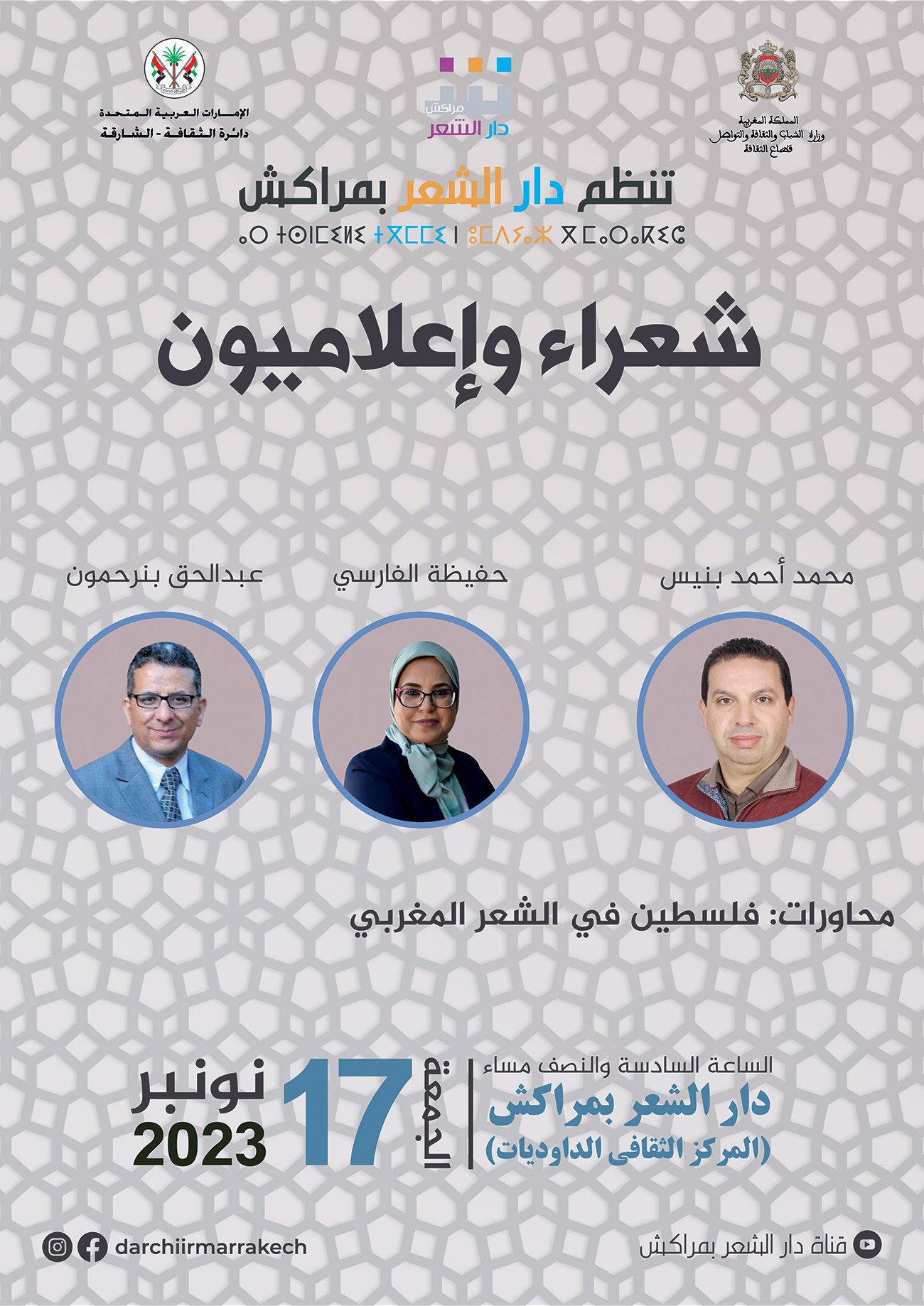 تنظم دار الشعر بمراكش، اليوم الجمعة، فقرة جديدة من برنامج «شعراء وإعلاميون»، احتفاء باليوم الوطني للإعلام، بفضاء الدار، الكائن بالمركز الثقافي الداوديات، وبمشاركة الشعراء: أحمد محمد بنيس وحفيظة الفارسي وعبد الحق بن رحمون. الفقرة، التي خصصتها دار الشعر بمراكش، لاستضافة شعراء يتقاسمون ولع الكتابة الشعرية، وأداء الرسالة الإعلامية، تسعى أن تكون نافذة مفتوحة على تجارب وأجيال الشعر المغربي الحديث.