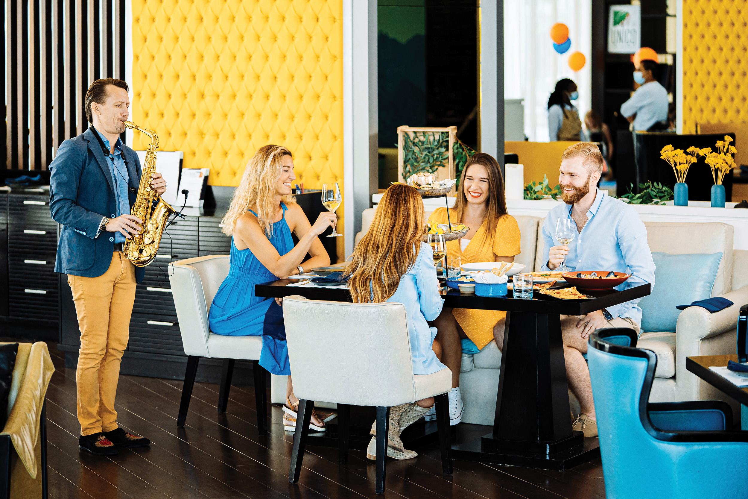 وجبة فطور وغداء عند غروب الشمس مع الترفيه الحي (عازف الساكسفون والدي جي) الزمان: كل يوم سبت من الساعة 5:30 مساءً إلى الساعة 9 مساءً المكان: صالة ومطعم بيور سكاي، هيلتون دبي الممشى، في جميرا بيتش ريزيدنس.