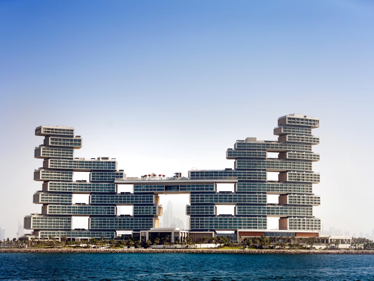 «أتلانتس ذا رويال»: وهذا الفندق على جزيرة نخلة جميرا، وفق مقال «فوربس»، يذكر بلعبة ليغو متشابكة، وهو عبارة عن هندسة معمارية حديثة، تم تصميمه على شكل هيكل منحنيّ من ستة أبراج مكدسة مثل كتل الأطفال، ومرتبط بجسر معلق يبلغ ارتفاعه 91 متراً، ويوفر المبنى غرفاً بإطلالات على البحر.