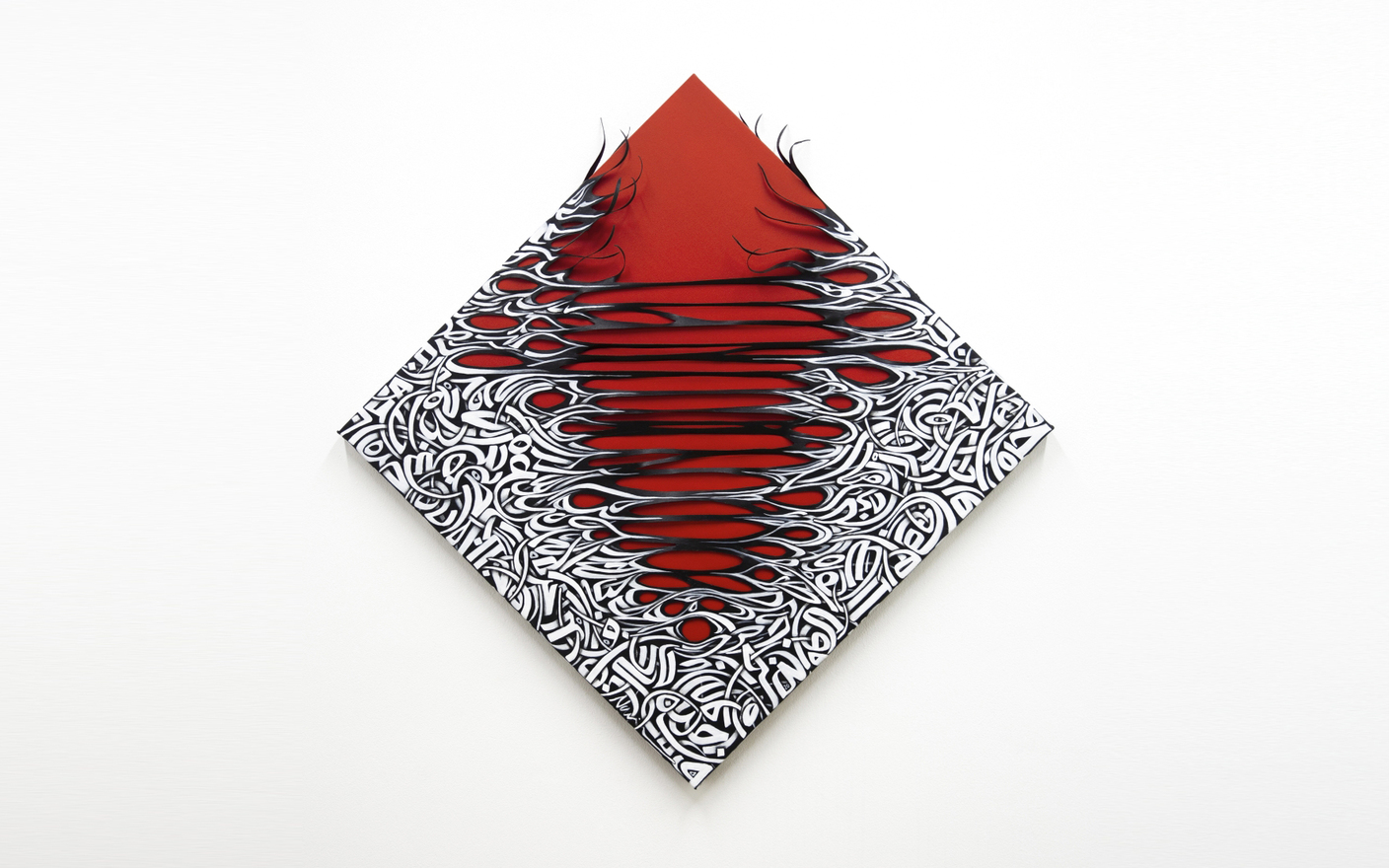 وخلال معرض «باراديمينسيونال»، يمزج ساسان بين الملموس والزائل، مسلطاً الضوء على طبيعة الواقع المتغيرة عبر تمدد القماش وإبراز مفهوم الخط بحدود استثنائية. ويصوغ ساسان، سيمفونية بصرية من خلال التفاعل المعقد بين الشكل واللون، ما يشكل تمثيلاً بصرياً للمساحة تبدو كما لو أنها تلتوي وتتجعد أمام عيون المشاهدين. الأنماط الخطية، والسلاسل، والإيقاع مغطاة بتشكيل جريء يعكس توتراً ديناميكياً بين سطح اللوحة ووهم العمق والحركة، موحياً ببوابة إلى بُعد آخر حيث يتحدى قواعد المنظور والهندسة التقليدية، مستحضراً إحساساً بالأبعاد الفريدة.