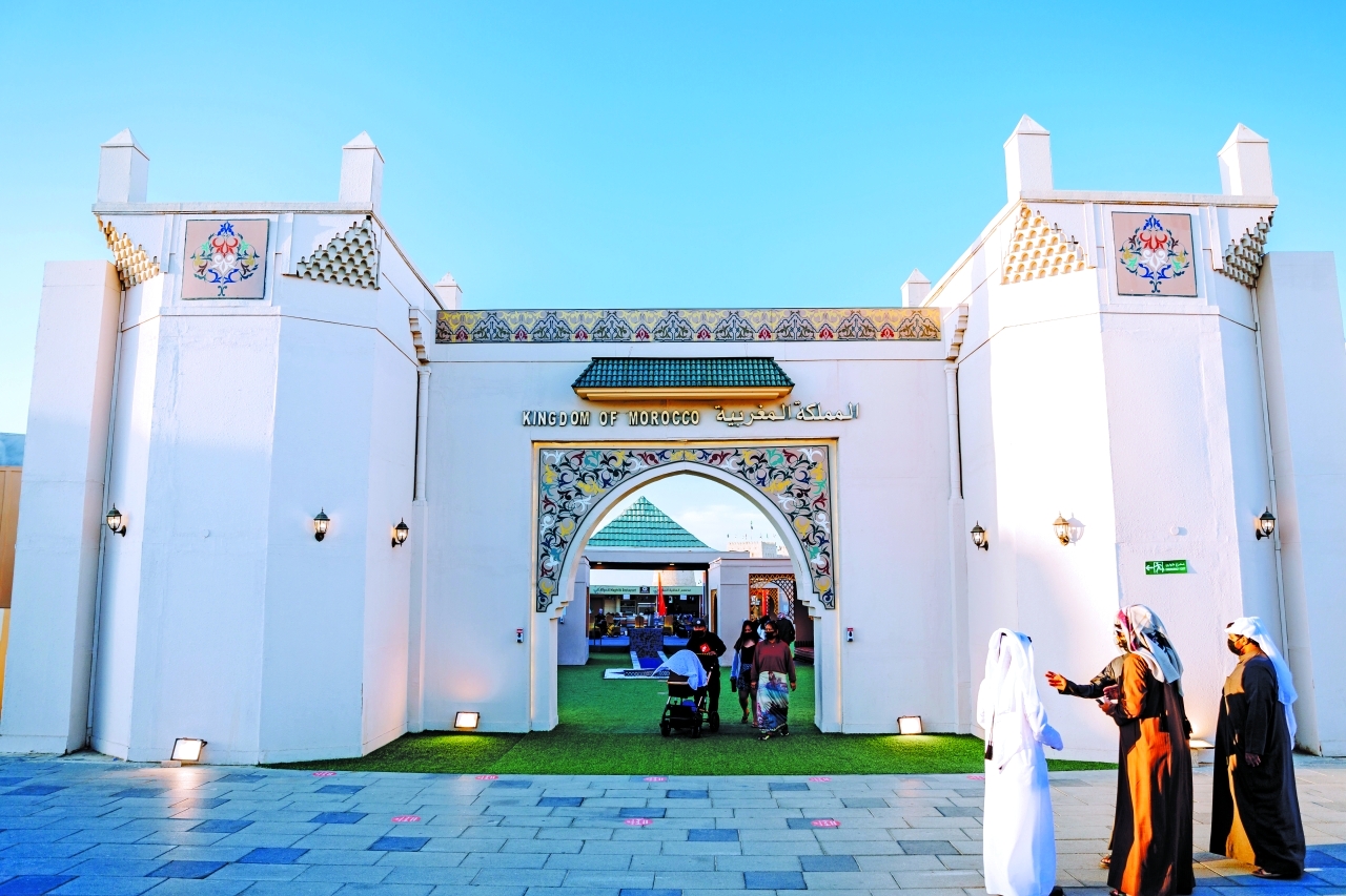 ويستقبل الجناح زواره بأجواء فريدة مغلّفة بالفخامة، يلاحظها الزائر منذ مروره من بوابة الجناح التي تم تصميمها بهندسة معمارية غاية في الدقة والروعة لتجسد بوابة فاس الشهيرة، ليجد الزائر نفسه وسط عشرات المحال المصممة هي الأخرى على شكل محلات سوق شعبي مغربي، تتوسطها ساحة كبرى تزيّنها النوافير والفسيفساء والجلسات المغربية، بالإضافة إلى المسرح الذي يقدم عروضاً فنية على مدار اليوم.