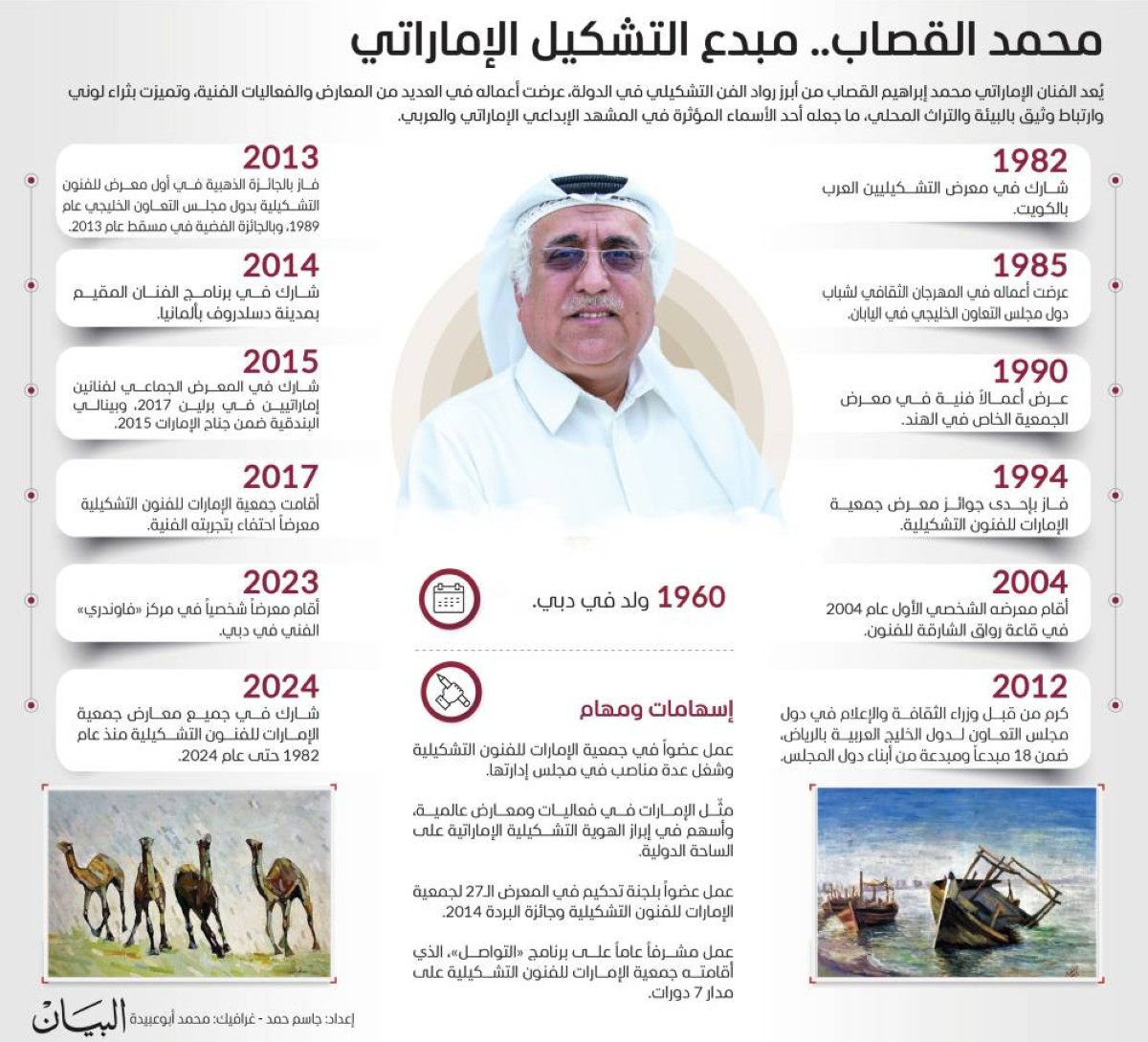 يُعد الفنان الإماراتي محمد إبراهيم القصاب من أبرز رواد الفن التشكيلي في الدولة، عرضت أعماله في العديد من المعارض والفعاليات الفنية، وتميزت بثراء لوني وارتباط وثيق بالبيئة والتراث المحلي، ما جعله أحد الأسماء المؤثرة في المشهد الإبداعي الإماراتي والعربي.