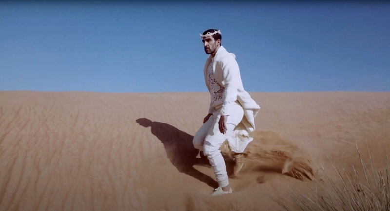 وظهر في الشريط الذي صُوّر في الصحراء رجال يرتدون ملابس بيضاء، تتراوح بين قمصان «تي شيرت» بالدانتيل وأزياء خليجية تقليدية.