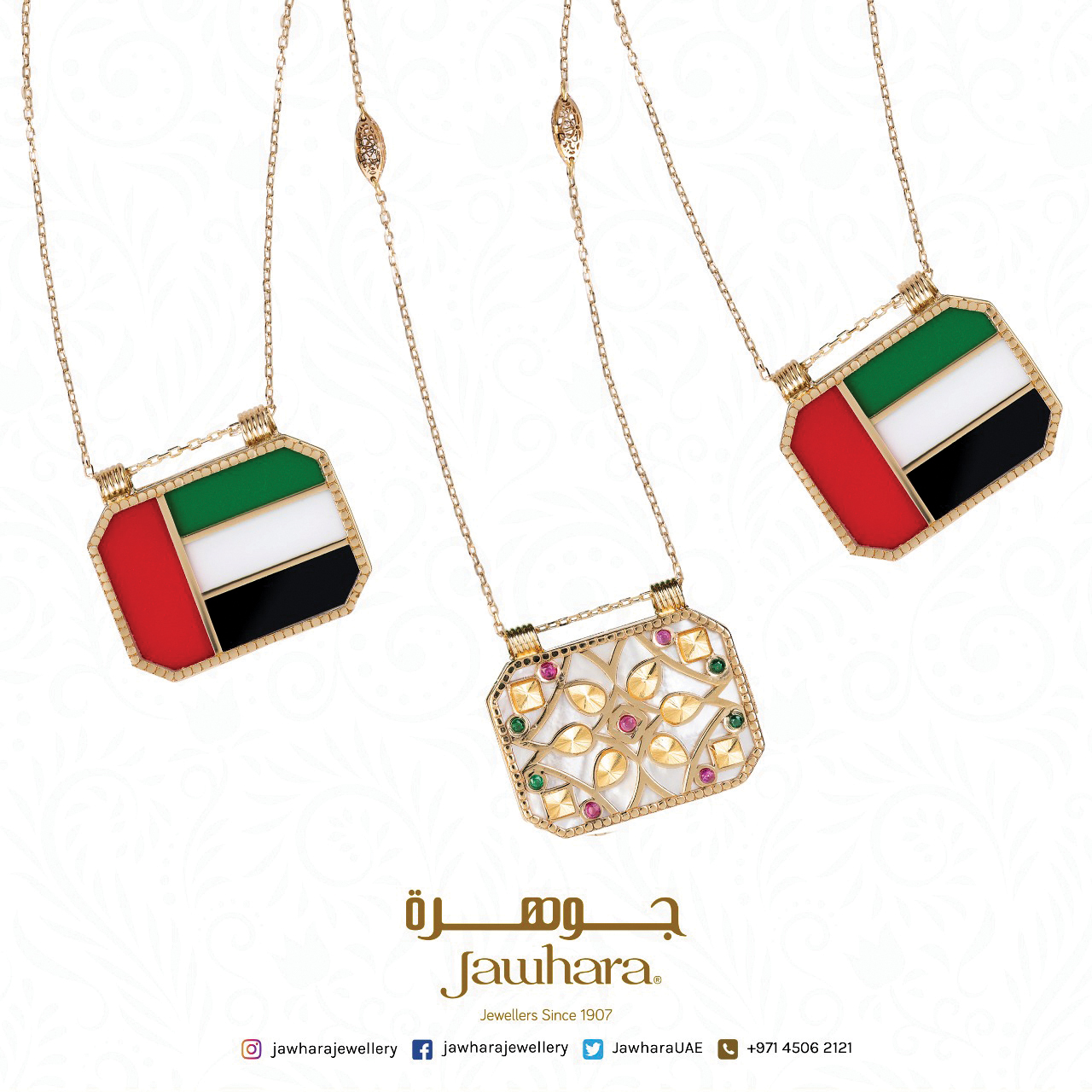 واحتفالاً بهذه المناسبة الوطنية المهمة طر حت مجوهرات جوهرة في فروعها كافة الـ185 والمنتشرة في المنطقة تصاميم حصرية من القلائد الذهبية التي تمثل علم دولة الإمارات بألوانه ورموزه السامية بتصاميم تراثية ترمز للسلام والأمل والازدهار.