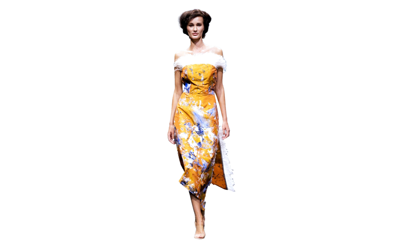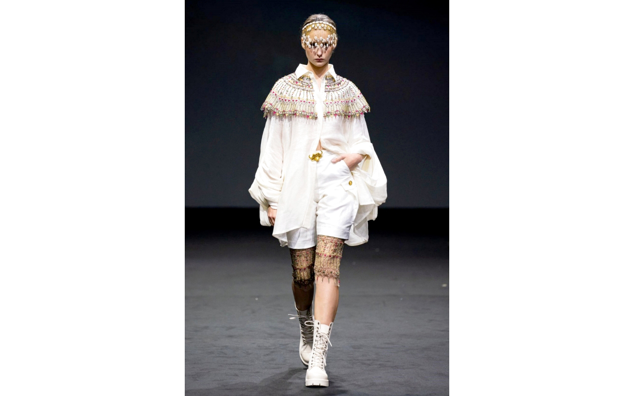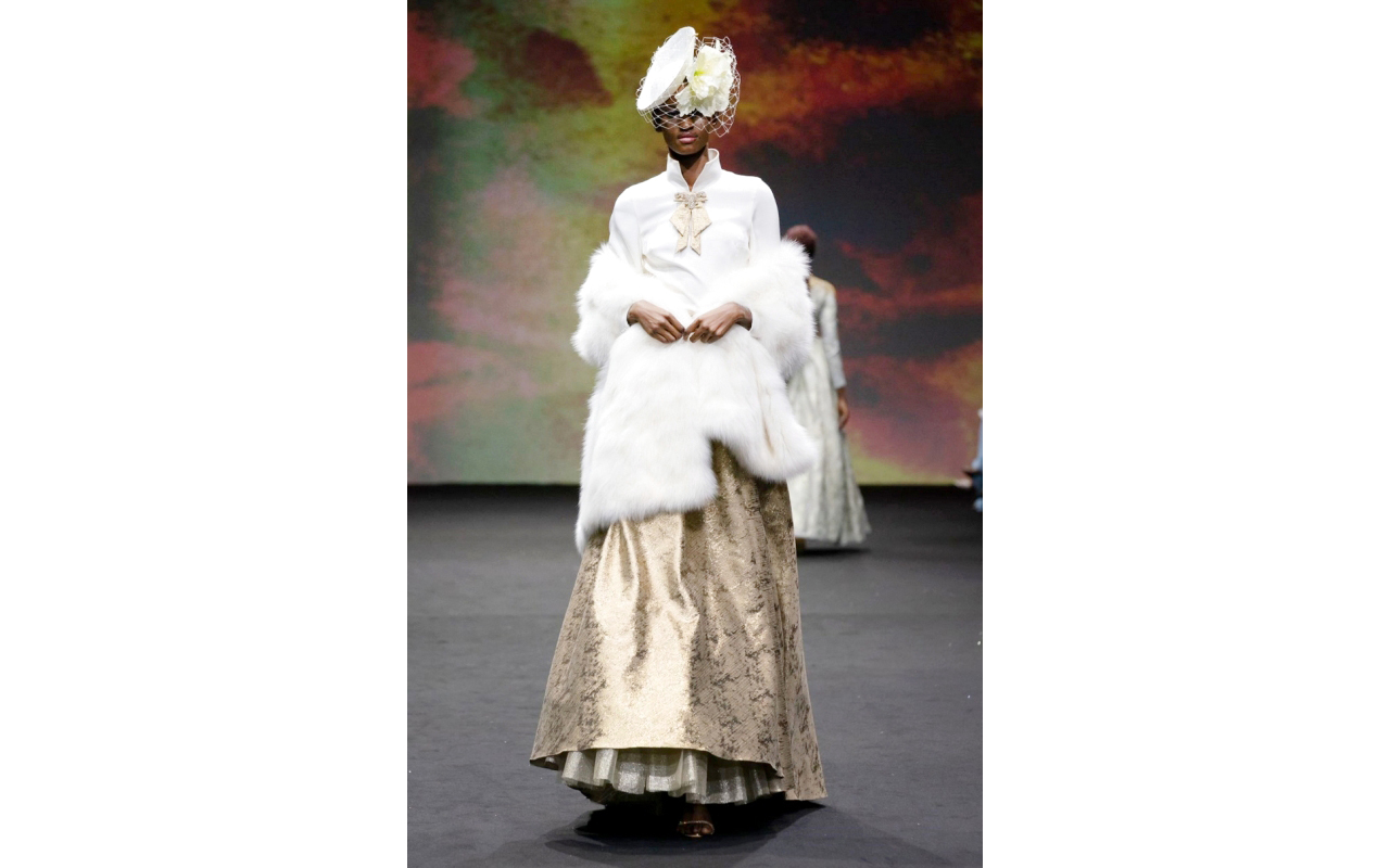 القطع المزينة بالريش جاءت ملهمة أيضاً، لا سيما في ظل الظلال الداكنة من الأسود والأزرق الغامق، كما كانت طبعات الحيوانات لمسة ممتعة رفعت من مستوى المجموعة، وزادت من رونقها عبر النسيج الشفاف، الذي حمل نقوشاً تشبه الوشوم على الجلد. وكان ختام العرض مع ارتداء العارضة غطاء رأس ذهبياً رائعاً، وغطاء رأس يصل إلى الأرض، محفوفاً بالريش، إلى جانب ثوب بأطياف الألوان الترابية.