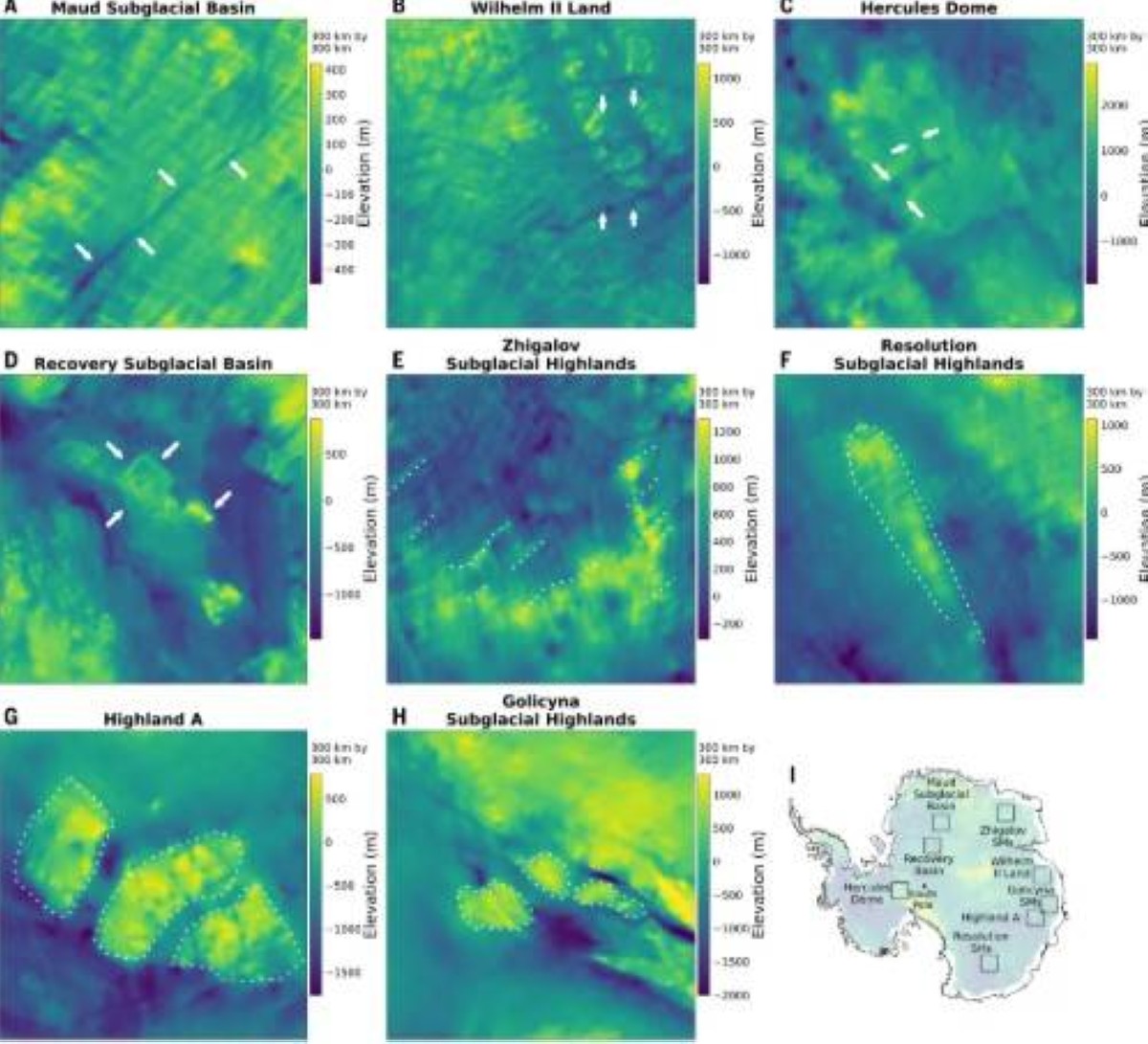 كشفت الخريطة الواسعة عن معالم تمتد من 1.2 إلى 18.6 ميل (من 2 إلى 30 كيلومترًا) تحت الغطاء الجليدي كانت غير معروفة أو غير واضحة للعلم من قبل، مثل قنوات الأنهار التي تمتد لمئات الأميال، والتي يمكن أن تكون آثارًا للمناظر الطبيعية التي سبقت الغطاء الجليدي.
