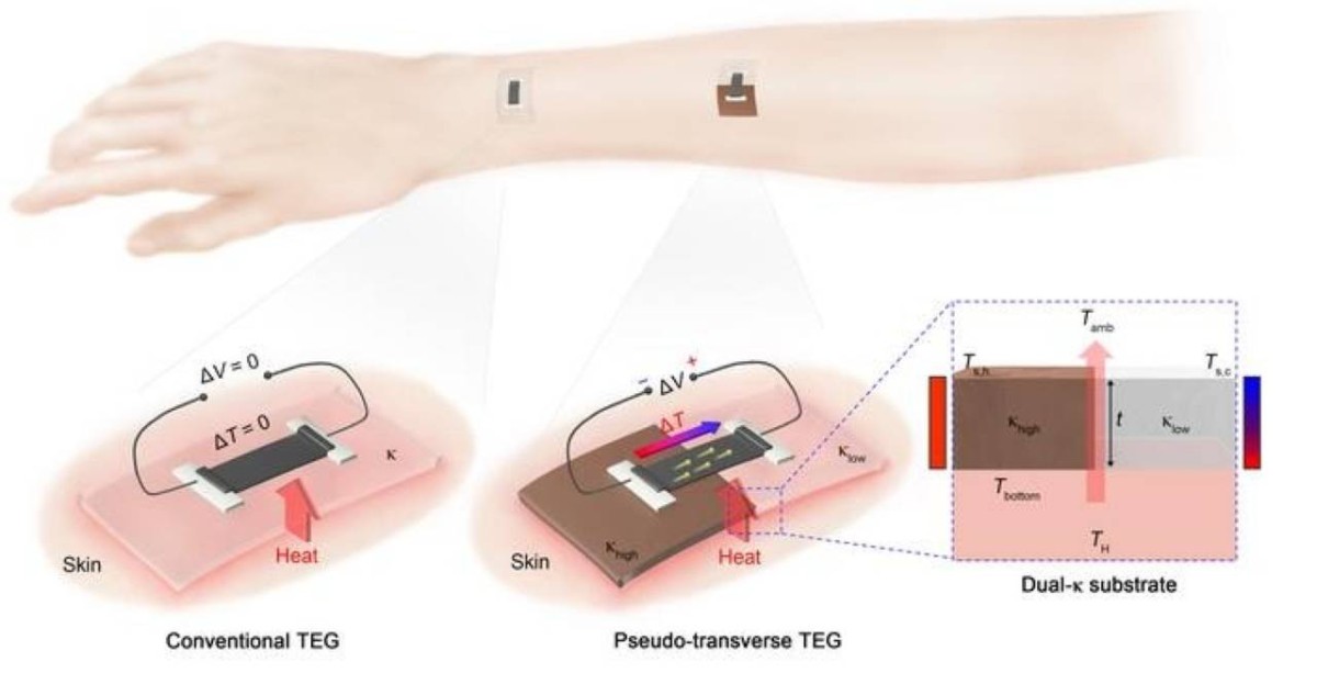 طوّر باحثو جامعة سيئول الوطنية مولداً حرارياً مرناً ورقيقاً للغاية، قادر على تحويل حرارة جسم الإنسان إلى طاقة كهربائية مستمرة. ونجح الفريق الكوري في حل هذه المشكلة عبر تصميم «ركيزة ثنائية الموصلية» تدمج جزيئات النحاس النانوية داخل السيليكون.