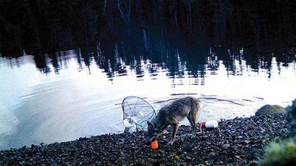 ووضع باحثون من كندا والولايات المتحدة كاميرات مراقبة في المنطقة، لتوثق مشاهد لأنثى ذئب تتمكن بمهارة من سحب شبكة صيد إلى الشاطئ مستخدمة أسنانها، ثم تتغذى على الأسماك العالقة فيها. ويعد هذا أول دليل علمي على استخدام ذئب لأداة بشرية في البرية.