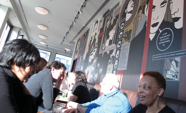 السيدة الأفريقية جلست إلى الطاولة المجاورة مع امرأة أخرى بدت ملامحها شرق أوروبية. انهمكت، على عادتي، بالتقاط صور للمكان، وبعض لوحات الغرافيتي التي تحتل الجدار، لأجد السيدة الأفريقية، في مرمى عدستي، مع وجه مليء بعلامات الاستفهام. أشحت بالكاميرا وابتسمت:«لا، ليس أنت، الصور خلفك هو ما قصدت تصويره»، قلت لها، فردت: «حسنا، لأنه ان كنت أنا المقصودة، علينا أن نوقع عقدا على الفور». ضحكنا، وكانت تلك بداية التعارف الذي أوصلني إلى تاريخ أسود للمدينة، لا يشبه تلك الألوان التي تسيطر على هذا الاجتماع البشري العالمي الضخم الذي اسمه «برلينالي»، والمستمد من فرح السينما وإنسانية الفن ضد التحزب والعنصرية.