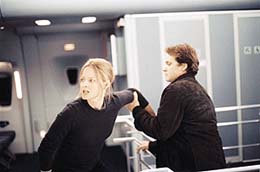 لكن ضابط الأمن على الطائرة (بيتر ساسبمارد) يقوم بضبطها على مقعدها لهنيهة، ثم يسمح لها بدخول »الحمام«، فتخرج من السقف وتبدأ بعملية تخريب لأجهزة الإضاءة، وسواها فتعم الفوضى في الطائرة، حتى يقتنع المشاهد أن هذه المرأة مجنونة وتتهيأ أن ابنتها كانت معها.