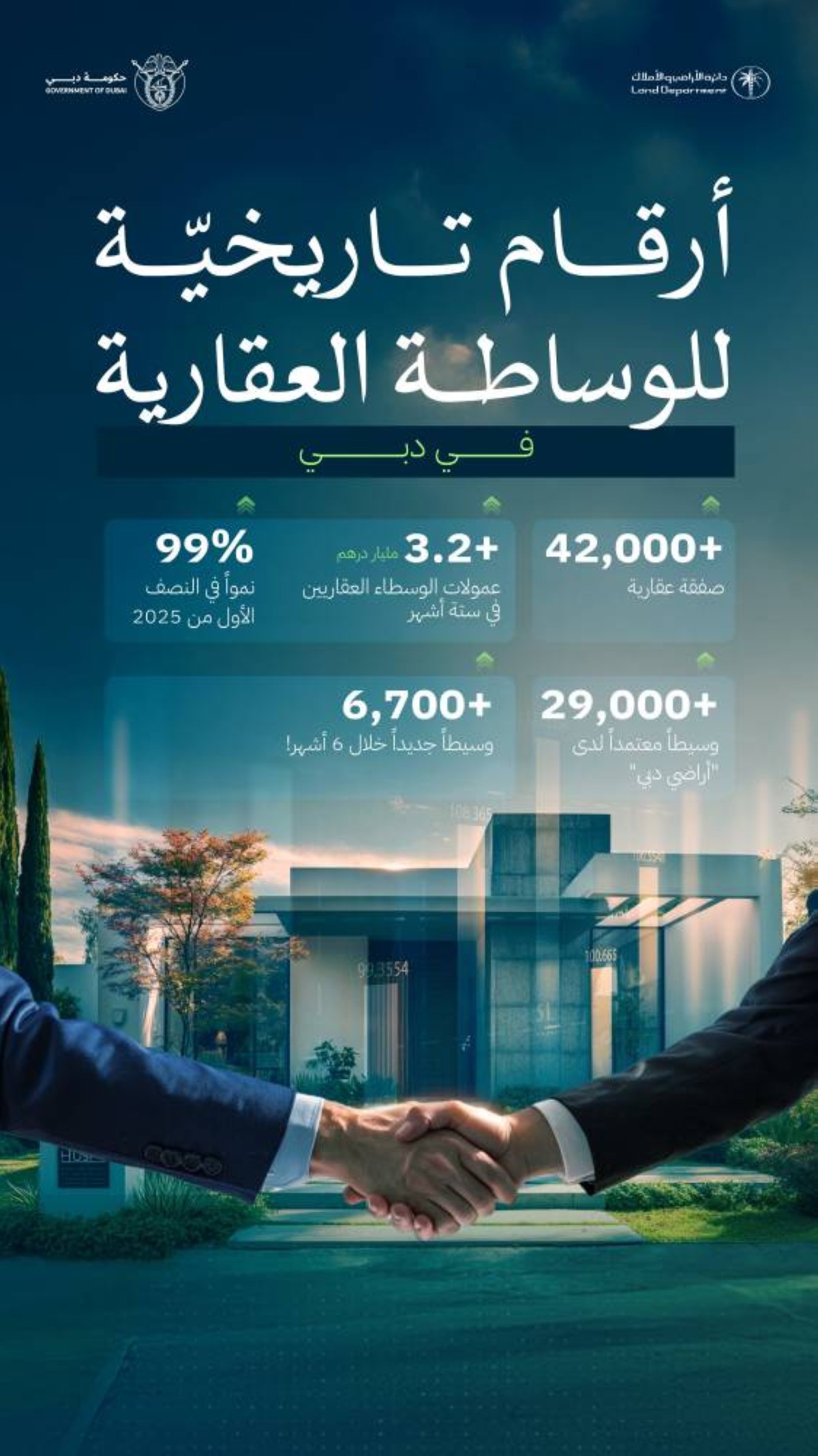 حقّق قطاع الوساطة العقارية في إمارة دبي نتائج مميزة خلال النصف الأول من العام الجاري، مؤكداً من جديد الدور المحوري للوسطاء في دعم ديناميكية السوق وتعزيز استدامة النمو في التصرفات العقارية، فقد أسهم الوسطاء العقاريون في تنفيذ 42,181 تصرفاً عقارياً، بقيمة عمولات تجاوزت 3.23 مليار درهم في النصف الأول من العام 2025 مقارنة ب 1.62 مليار درهم خلال نفس الفترة من عام 2024، بنسبة نمو 99%.
