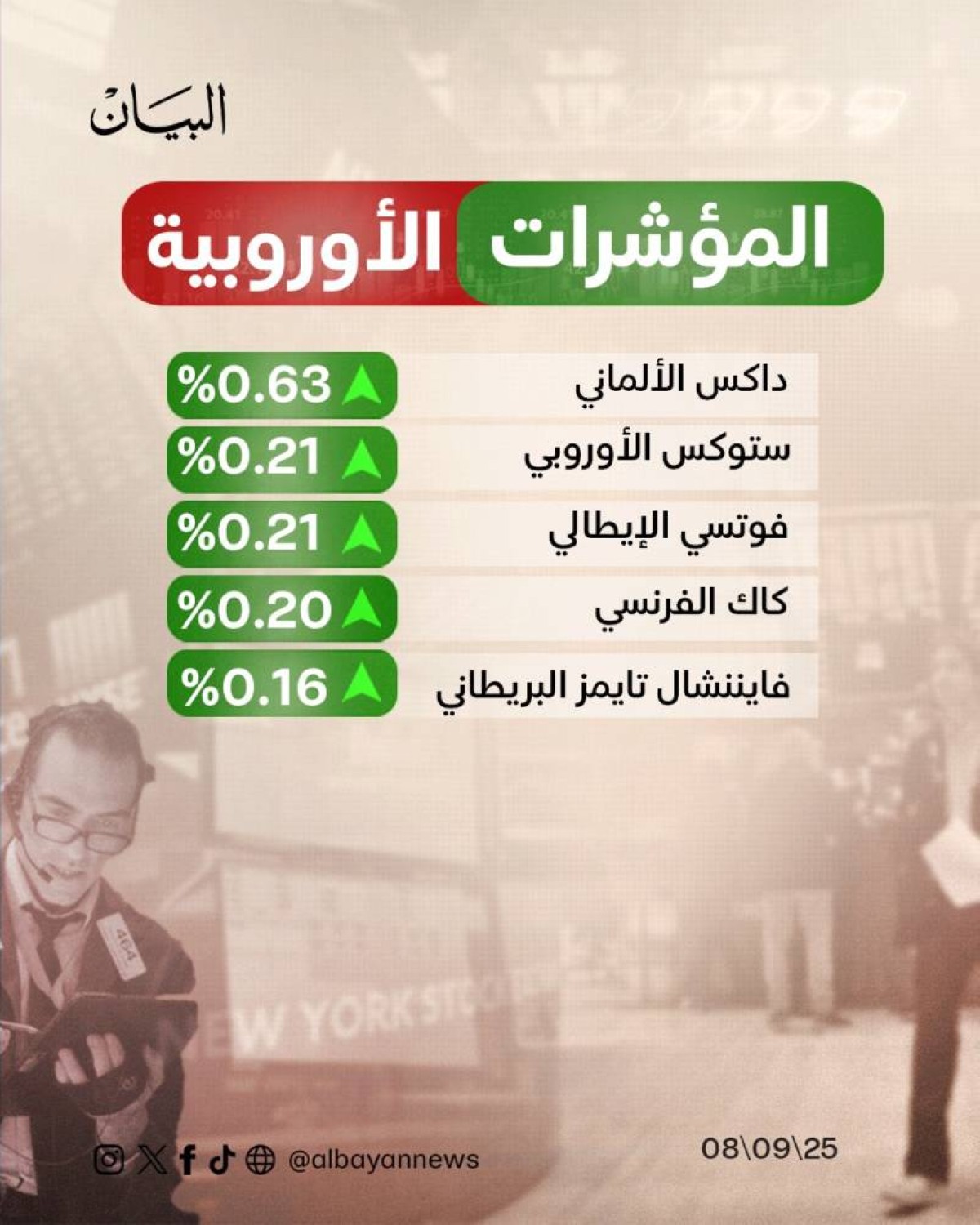 وخلال التعاملات صعد مؤشر ستوكس 600 الأوروبي 0.33% إلى 551 نقطة، وكسب مؤشر كاك 40 الفرنسي 0.4%.