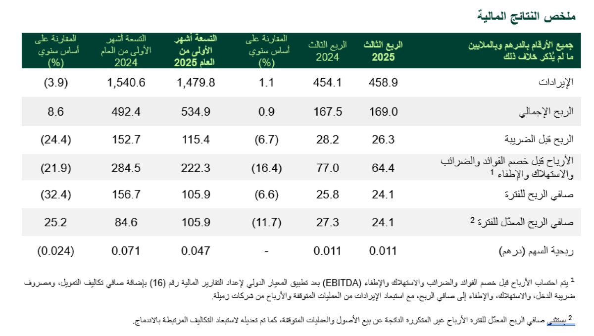 على الرغم من تراجُع صافي الربح المحاسبي من156.7 مليون درهم خلال التسعة أشهر من العام 2024 إلى 105.9 مليون درهم خلال التسعة أشهر من العام 2025، إلا أن المجموعة امتازت بأداء جيد على أساس معدّل، حيث ارتفع صافي الربح المعدّل بنسبة 25% مدفوعاً بتحسن الأداء التشغيلي وانخفاض تكاليف التمويل. يُذكر أن نتائج التسعة أشهر من العام الماضي قد استفادت من مكاسب غير متكررة ناتجة عن بيع أصول غير أساسية، قابَلها جزئياً مصروفات مرتبطة بعملية الاندماج.