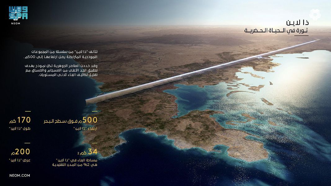 وقالت الوكالة إن من أهم مواصفات مدينة "ذا لاين"، أن عرضها يبلغ 200 متر فقط على امتداد 170 كيلومترا، وارتفاعٍ يبلغ 500 متر فوق سطح البحر، وإنها ستُبنى على مساحة لا تتجاوز 34 كيلومترا مربعا، وستتسع لنحو 9 ملايين نسمة، ووصفت ذلك بأنه "أمر غير مسبوق تماما في مدن بهذا الحجم".