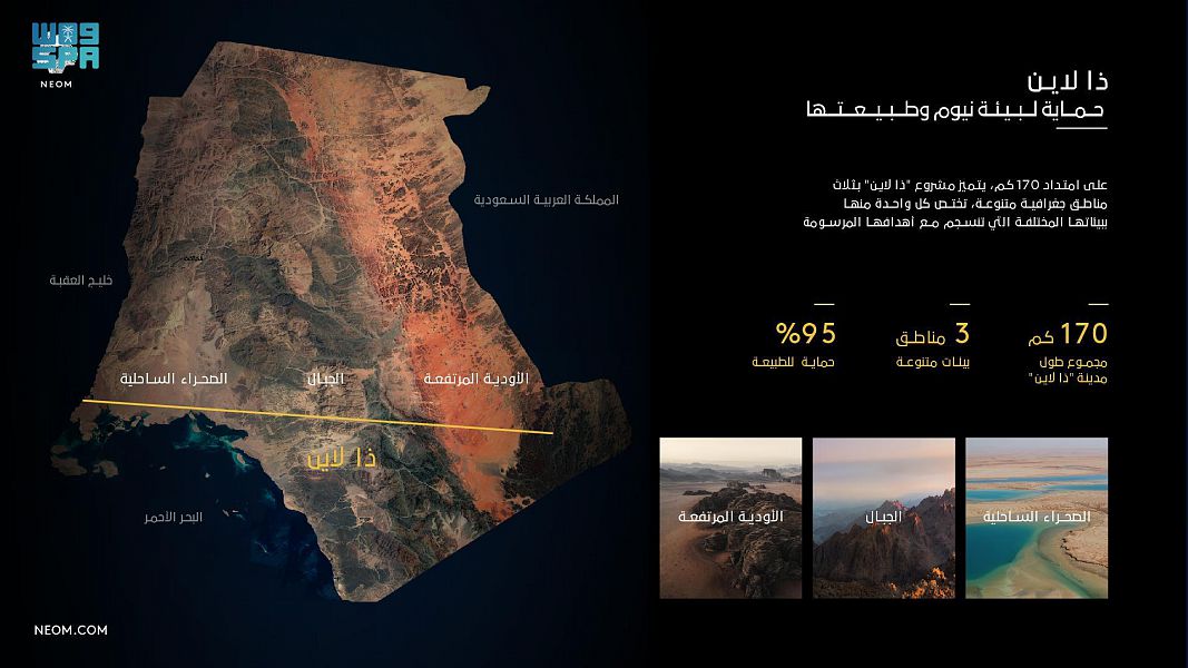 وذكرت وكالة الأنباء السعودية أن ولي العهد، رئيس مجلس إدارة "نيوم"، أعلن تصاميم المدينة التي تشكل "انعكاسا لما ستكون عليه المجتمعات الحضرية مستقبلا في بيئة خالية من الشوارع والسيارات والانبعاثات، وتسهم في المحافظة على 95 في المئة من أراضي نيوم للطبيعة، وتعتمد على الطاقة المتجددة بنسبة 100 في المئة".
