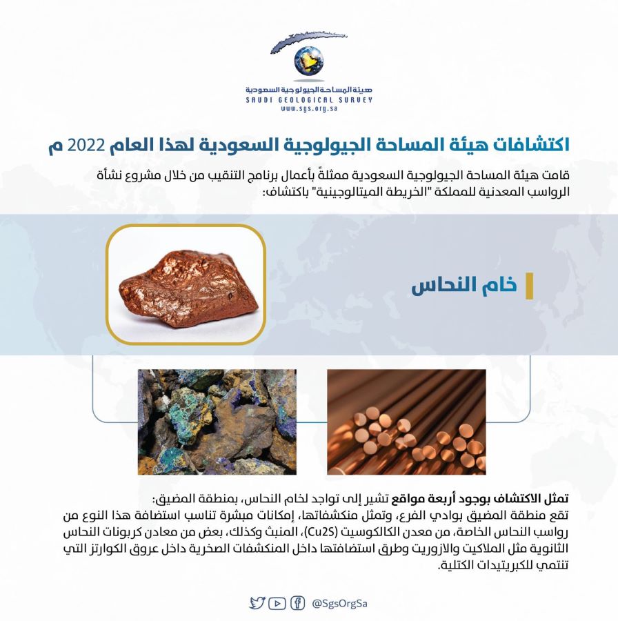 وقالت هيئة المساحة أنه بالنسبة لخام النحاس، تم اكتشاف أربعة مواقع بمنطقة المضيق بوادي الفرع بمنطقة المدينة المنورة.