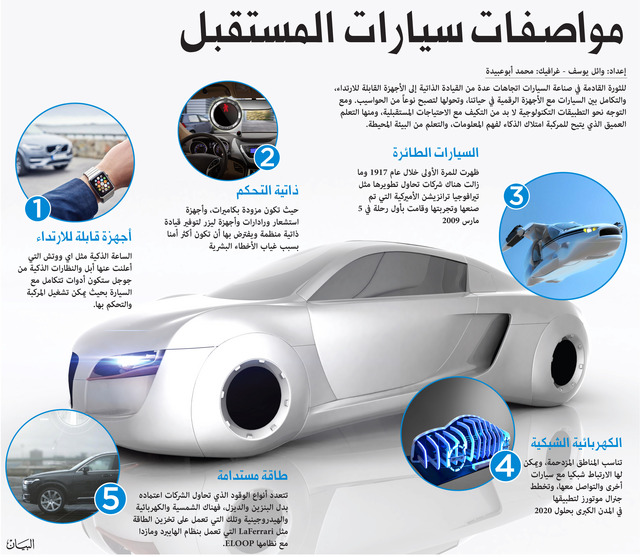 الساعة الذكية مثل اي ووتش التي أعلنت عنها أبل والنظارات الذكية من جوجل ستكون أدوات تتكامل مع السيارة بحيث يمكن تشغيل المركبة والتحكم بها.