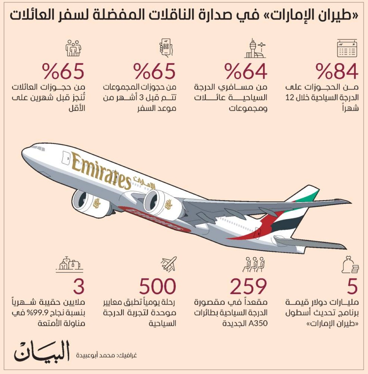 وتظهر أرقام الحجوزات أن الدرجة السياحية استأثرت بنسبة 84 % من إجمالي حجوزات السفر على متن رحلات الناقلة، وأن حجوزات المجموعات والعائلات 64 % شكلت من إجمالي المسافرين في هذه الدرجة، وأن شهر يناير، هو ذروة موسم السفر للعائلات.