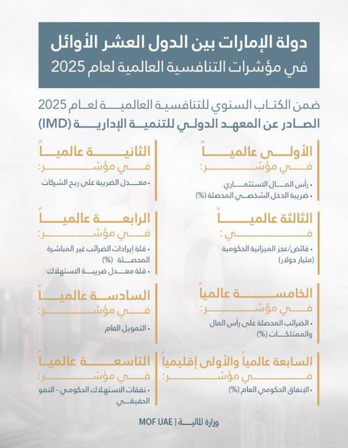 وبحسب الكتاب السنوي للتنافسية العالمية 2025، فقد جاءت دولة الإمارات ضمن الدول العشر الأوائل عالمياً في عدد من مؤشرات التنافسية، مما يعكس الأداء المالي المتقدم للدولة، حيث حصدت المرتبة الأولى عالمياً في مؤشري رأس المال الاستثماري، ونسبة ضريبة الدخل الشخصي المحصلة، كما جاءت في المرتبة الثانية في مؤشر معدل الضريبة على ربح الشركات، والمرتبة الثالثة في مؤشر فائض/عجز الميزانية الحكومية (مليار دولار)، واحتلت المرتبة الرابعة في نسبة انخفاض إيرادات الضرائب غير المباشرة المحصلة، وانخفاض معدل ضريبة الاستهلاك، كما جاءت في المرتبة الخامسة في مؤشر نسبة الضرائب المحصلة على رأس المال والممتلكات، والمرتبة السادسة في مؤشر التمويل العام، والسابعة عالمياً والأولى إقليمياً في مؤشر نسبة الإنفاق الحكومي العام، والتاسعة عالمياً في مؤشر نفقات الاستهلاك الحكومي - النمو الحقيقي.