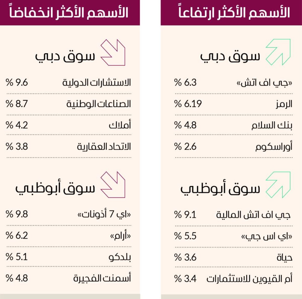 أما على الأكثر تراجعاً فقد انخفض سهم مجموعة «اي 7- أذونات» بنسبة 9.8% ثم سهم «أرام» بنسبة 6.2% ثم سهم «بلدكو» بنسبة 5.1%، فيما تراجع سهم شركة «أسمنت الفجيرة» بنسبة 4.8%، بينما تقلص سهم «أبوظبي لبناء السفن» بنسبة 4.4%، وأقفل سهم «أدنوك للغاز» منخفضاً بنسبة 1.5% عند 3.34 دراهم، وانخفض سهم «ملتيبلاي» بنسبة 2.2%.