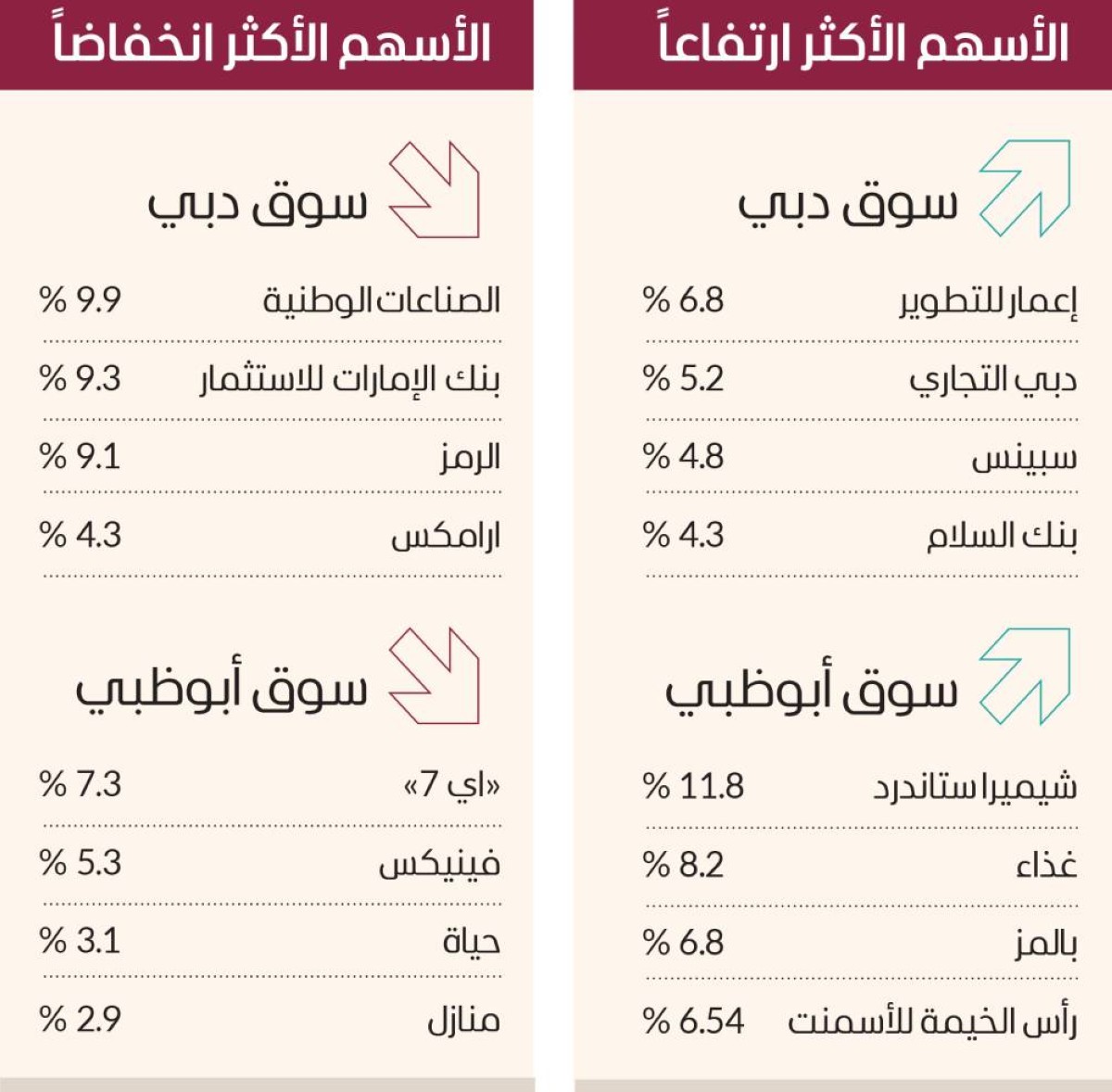 بينما شهد سوق أبوظبي ربحية كل من سهم «شيميرا ستاندرد» 11.8 % و«غذاء القابضة» 8.3 % و«بالمز» 6.8 % و«رأس الخيمة للأسمنت» 6.54 % و«أبوظبي للموانئ» 6.53 %.