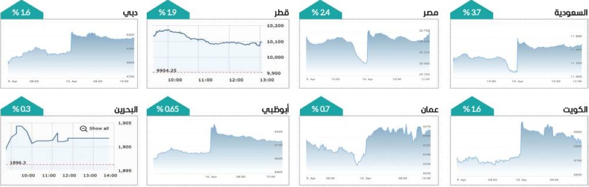 ارتفعت أسواق الأسهم في المنطقة العربية، الخميس، بعدما علق الرئيس الأمريكي الرسوم الجمركية المتبادلة مع أغلب دول العالم لمدة 90 يوماً.
