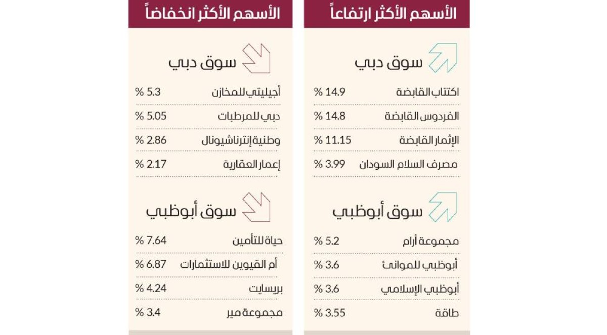 وصعدت في سوق دبي أسهم الإثمار القابضة 11.15%، ومصرف السلام السودان 3.99%، وسوق دبي المالي 1.9%، فيما انخفضت أسهم أجيليتي للمخازن 5.3%، ودبي للمرطبات 5.05%، ووطنية إنترناشيونال 2.86%، وإعمار العقارية 2.17%.