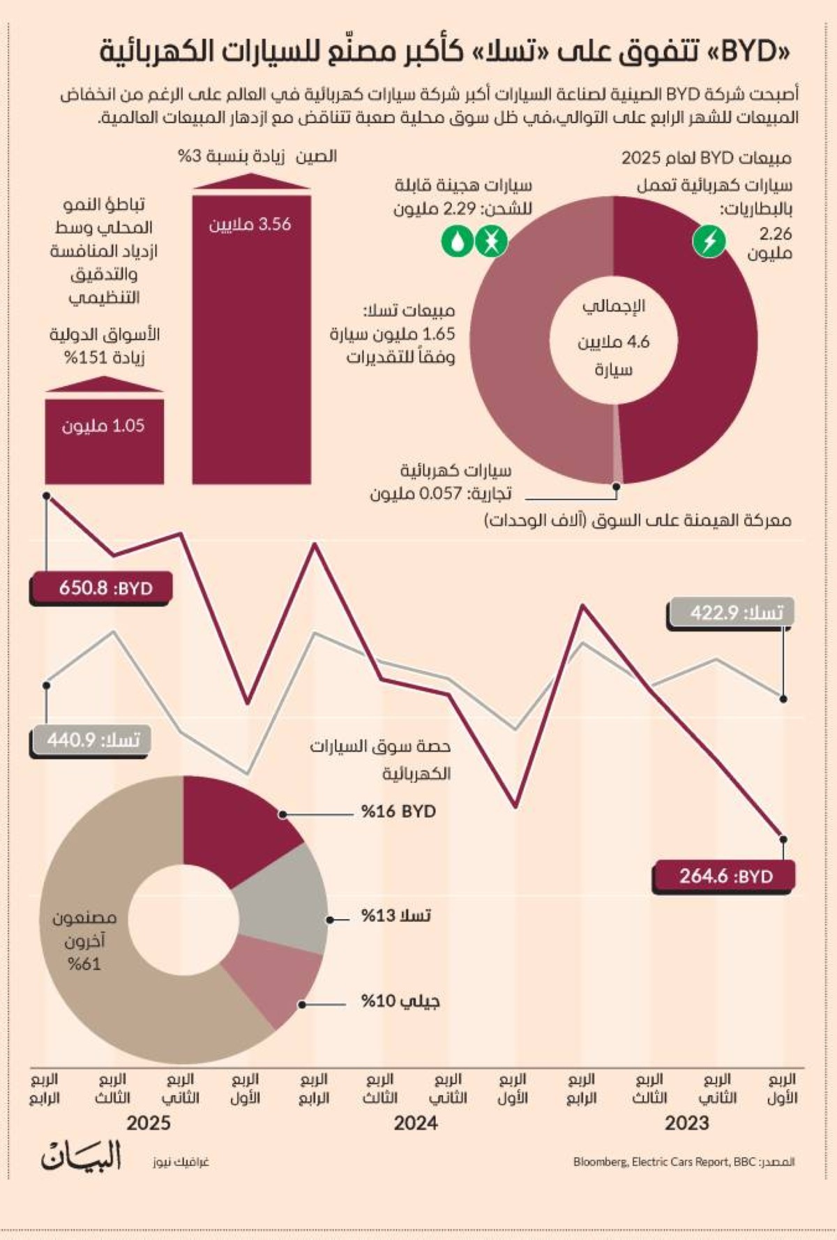 أﺻﺒﺤﺖ ﺷﺮﻛﺔ BYD اﻟﺼﻴﻨﻴﺔ ﻟﺼﻨﺎﻋﺔ اﻟﺴﻴﺎرات أﻛﺒﺮ ﺷﺮﻛﺔ ﺳﻴﺎرات ﻛﻬﺮﺑﺎﺋﻴﺔ ﻓﻲ اﻟﻌﺎﻟﻢ ﻋﻠﻰ اﻟﺮﻏﻢ ﻣﻦ اﻧﺨﻔﺎض اﻟﻤﺒﻴﻌﺎت ﻟﻠﺸﻬﺮ اﻟﺮاﺑﻊ ﻋﻠﻰ اﻟﺘﻮاﻟﻲ،ﻓﻲ ﻇﻞ ﺳﻮق ﻣﺤﻠﻴﺔ ﺻﻌﺒﺔ ﺗﺘﻨﺎﻗﺾ ﻣﻊ ازدﻫﺎر اﻟﻤﺒﻴﻌﺎت اﻟﻌﺎﻟﻤﻴﺔ.